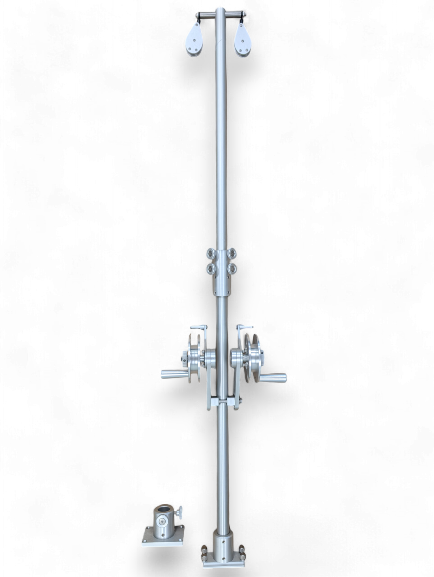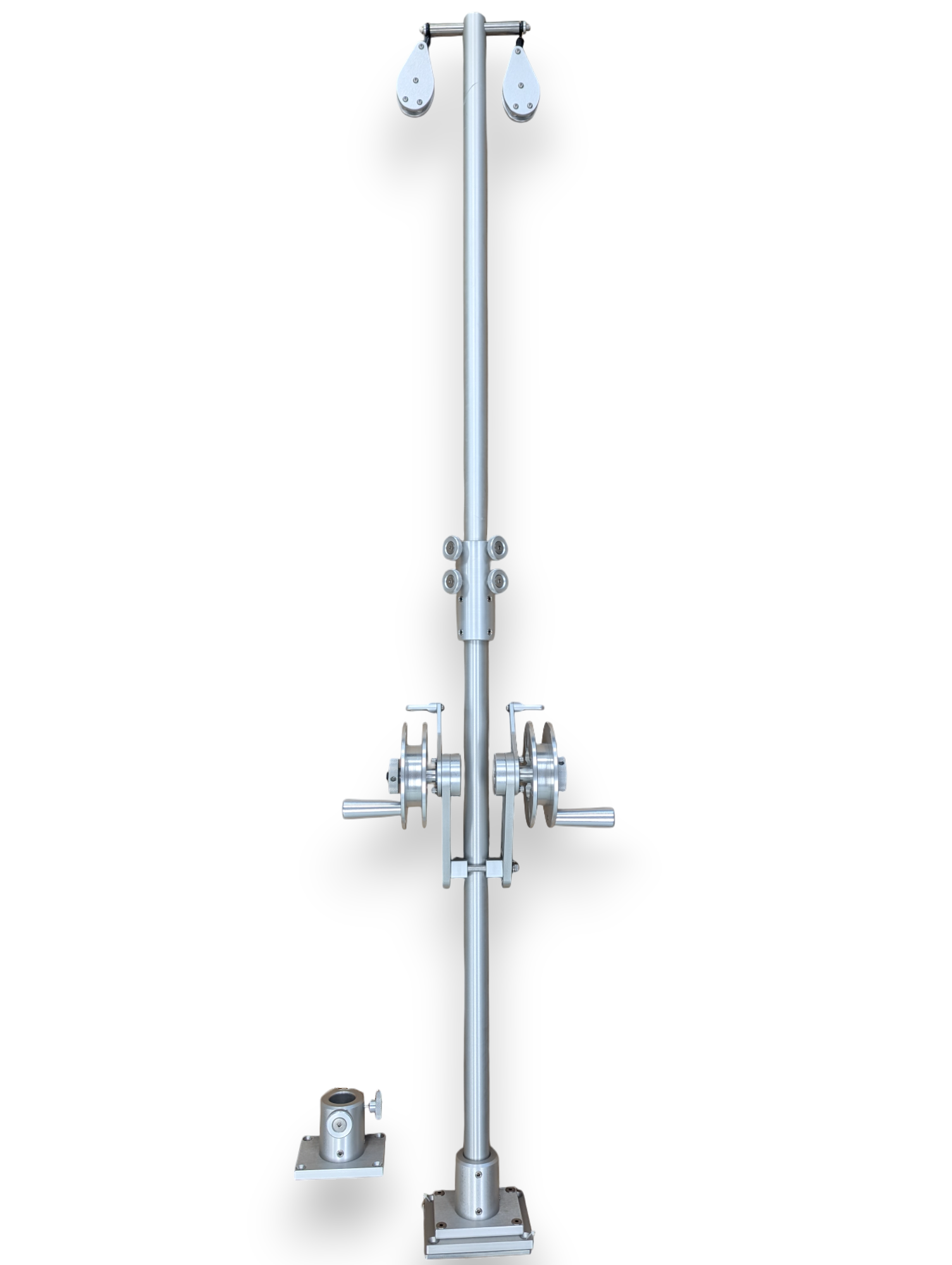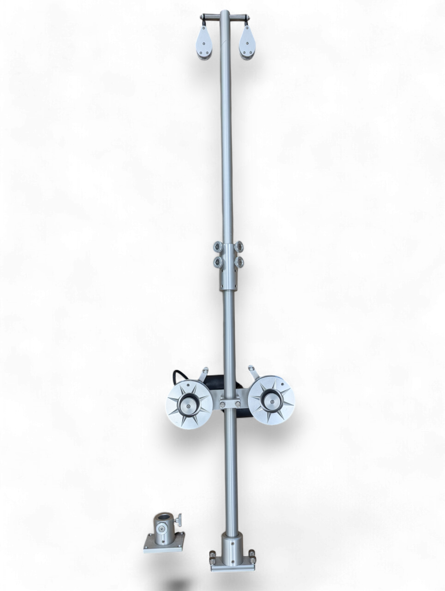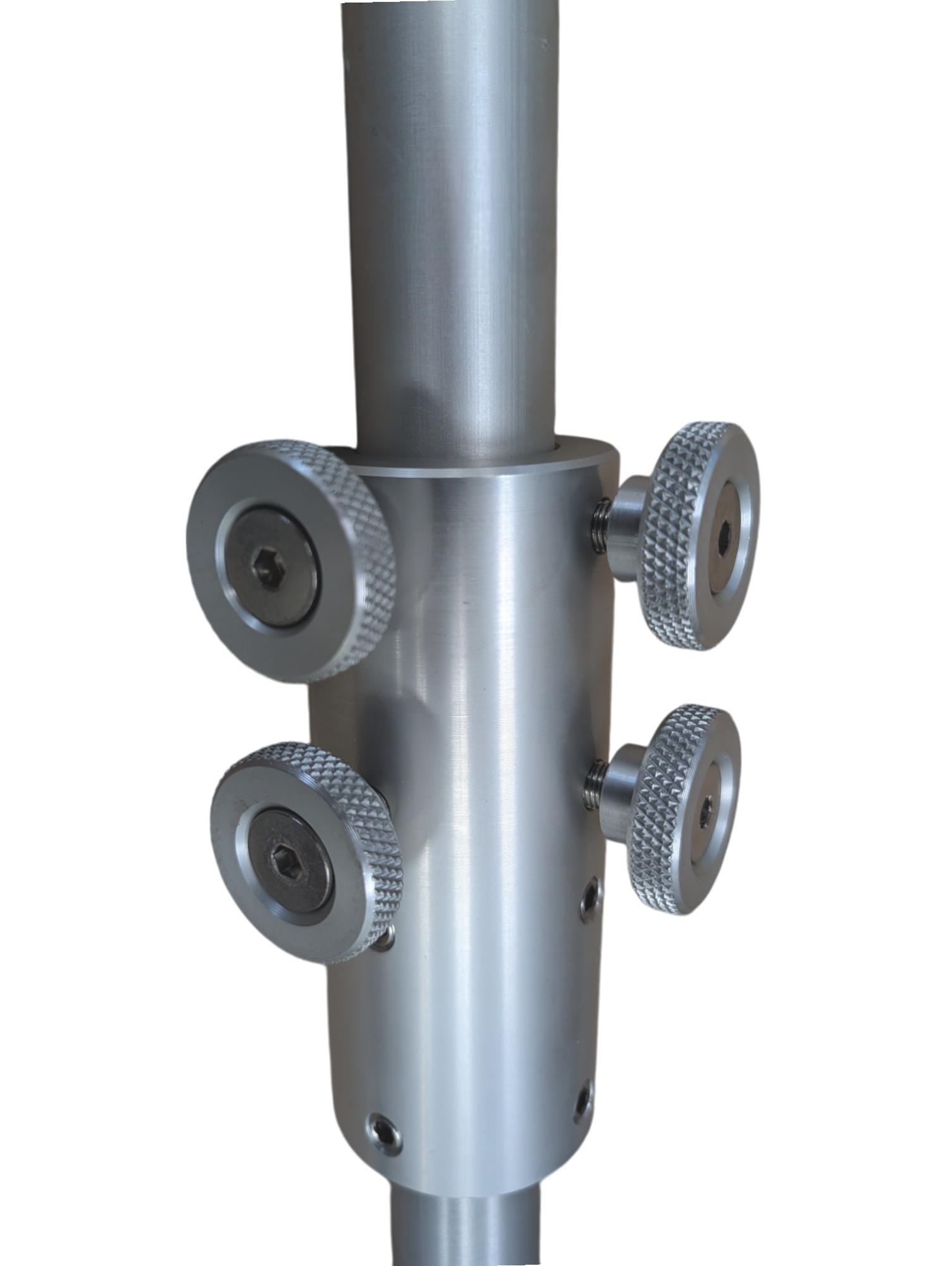 The masts with a Break-Away option are designed to be split in half to clear obstacles like bridges, garages, and electrical lines. The two halves are joined together by a machined aluminum collar and locked in place by custom knurled thumbscrews. The thumbscrews lock into indentations machined into the mast to ensure the material always fits securely together, with no material galling. An additional mounting base is also provided to store the mast vertically next to the other half of the mast to your planer mast lines do not need to be unspooled each time.