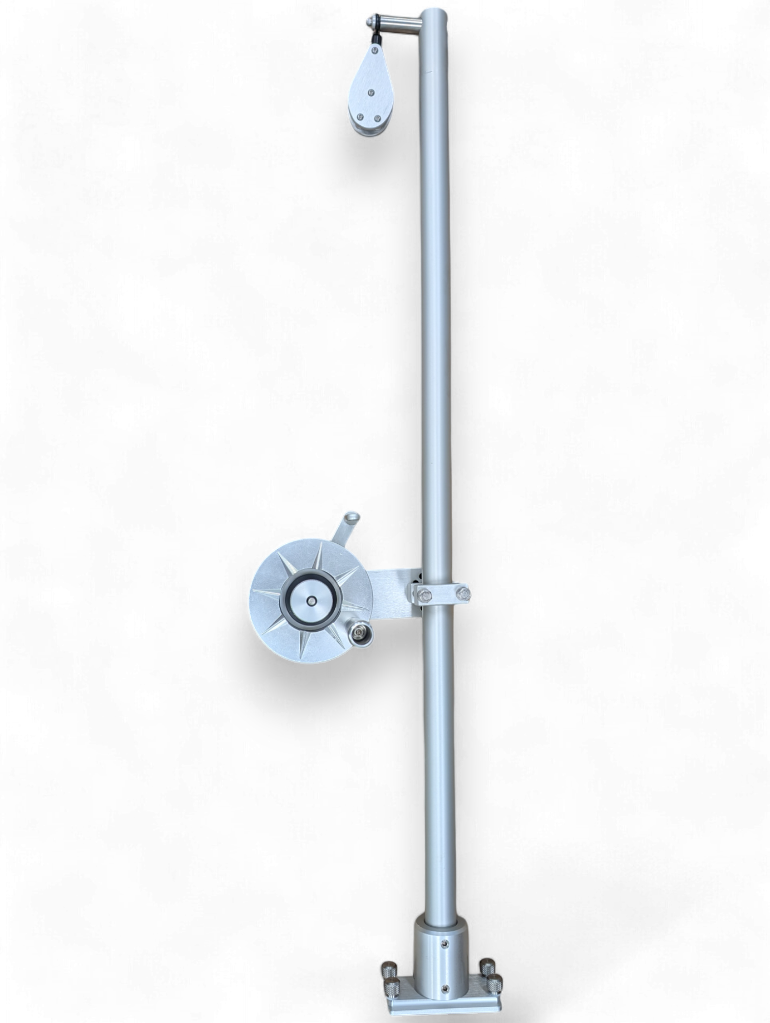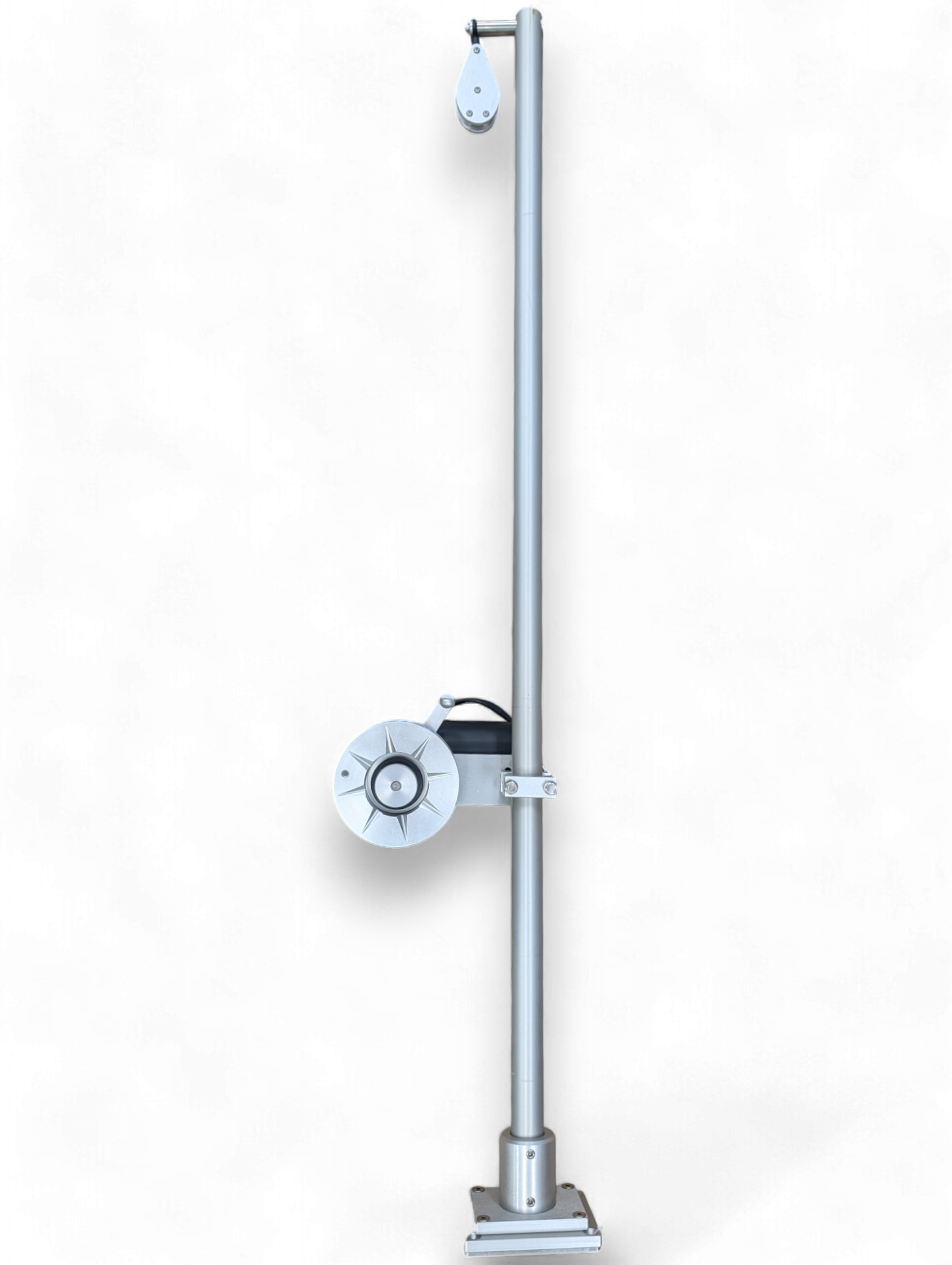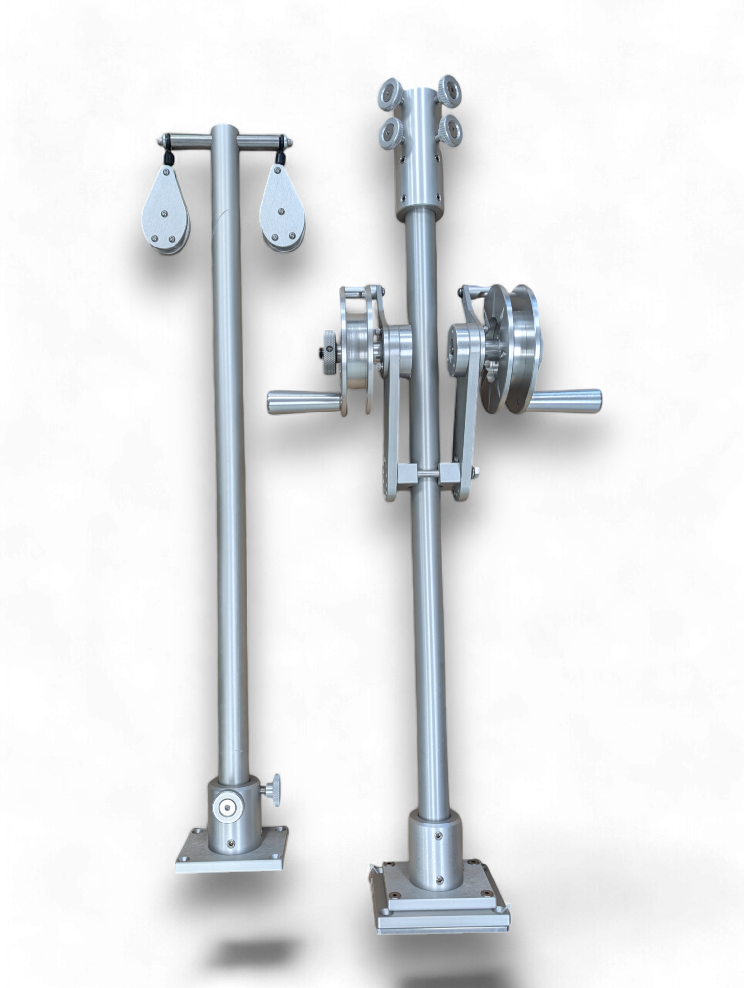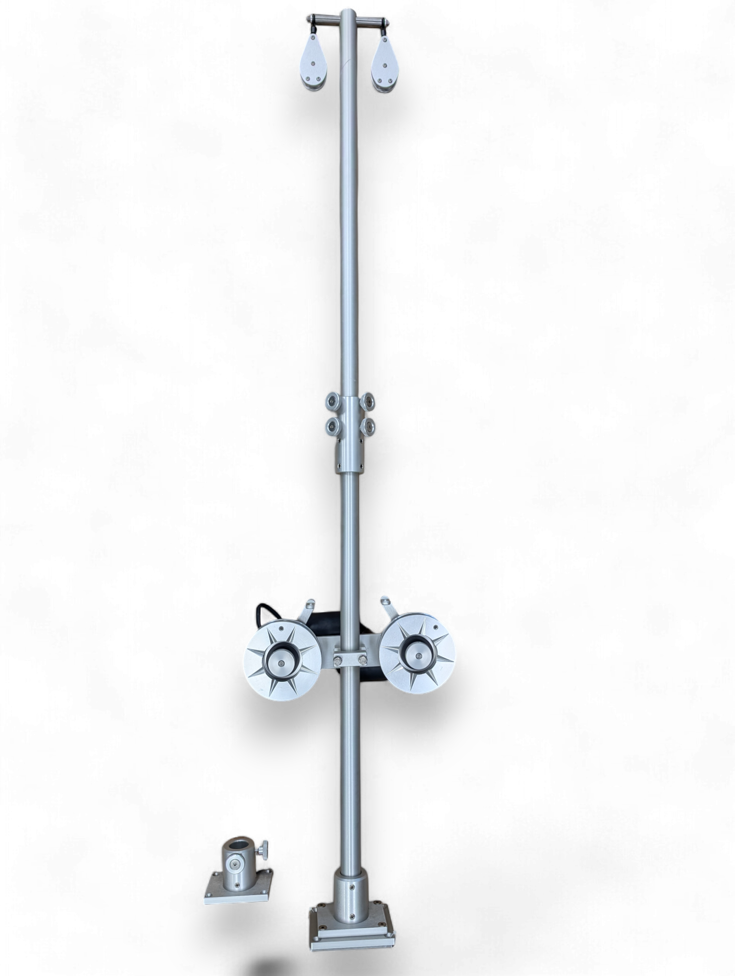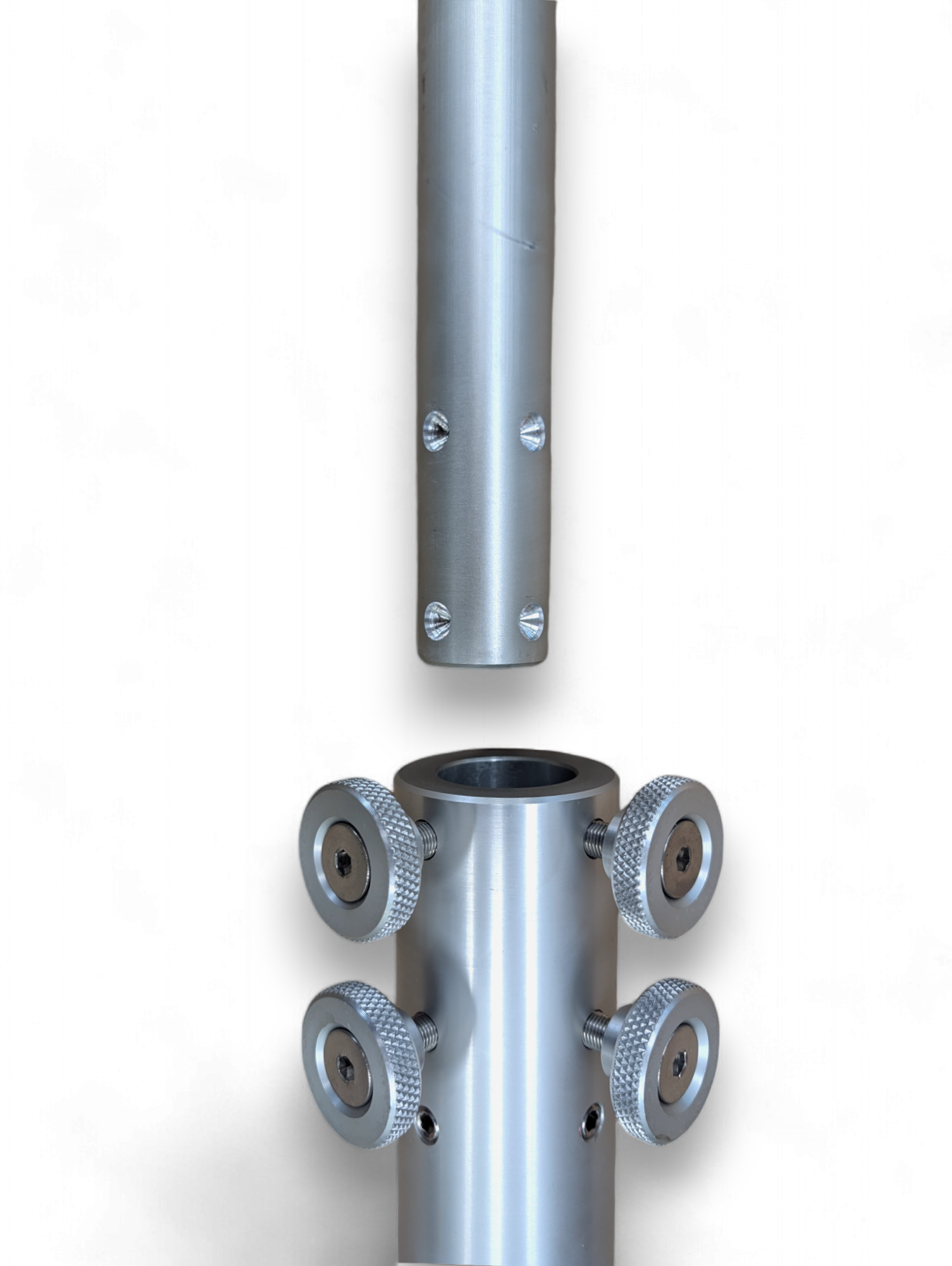 The masts with a Break-Away option are designed to be split in half to clear obstacles like bridges, garages, and electrical lines. The two halves are joined together by a machined aluminum collar and locked in place by custom knurled thumbscrews. The thumbscrews lock into indentations machined into the mast to ensure the material always fits securely together, with no material galling. An additional mounting base is also provided to store the mast vertically next to the other half of the mast to your planer mast lines do not need to be unspooled each time.