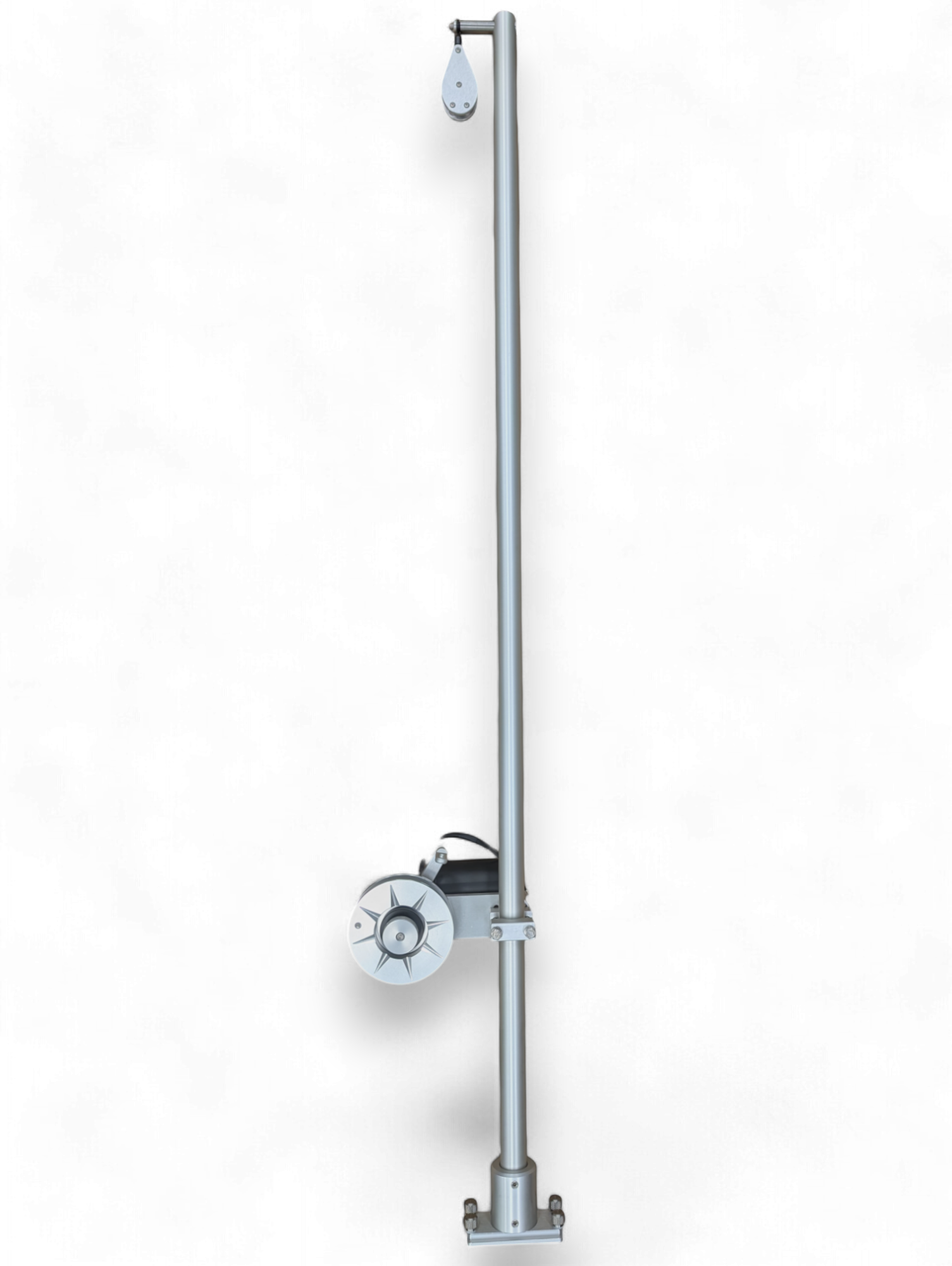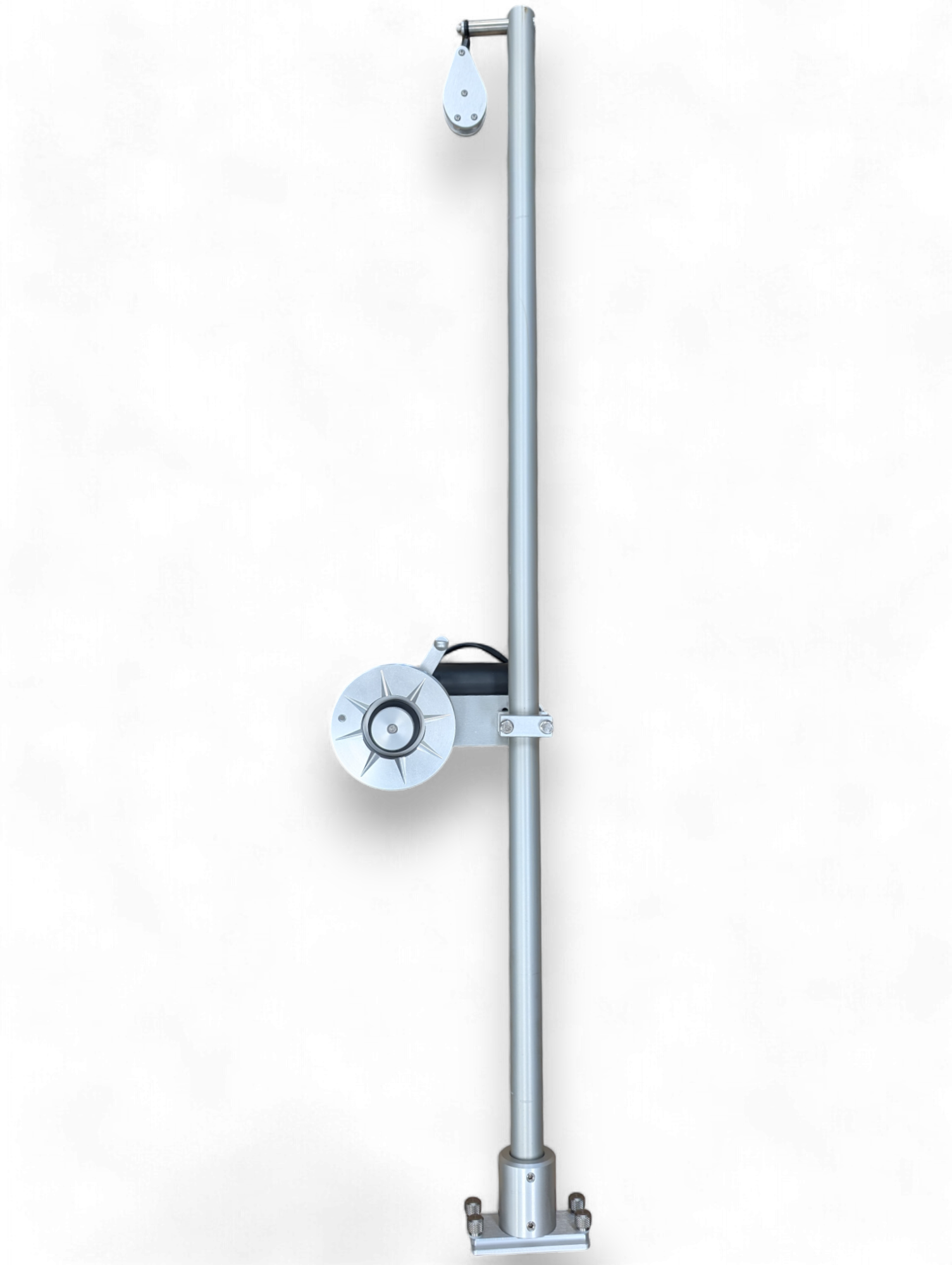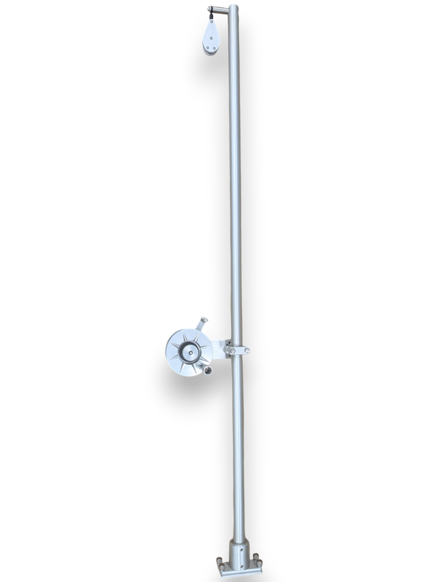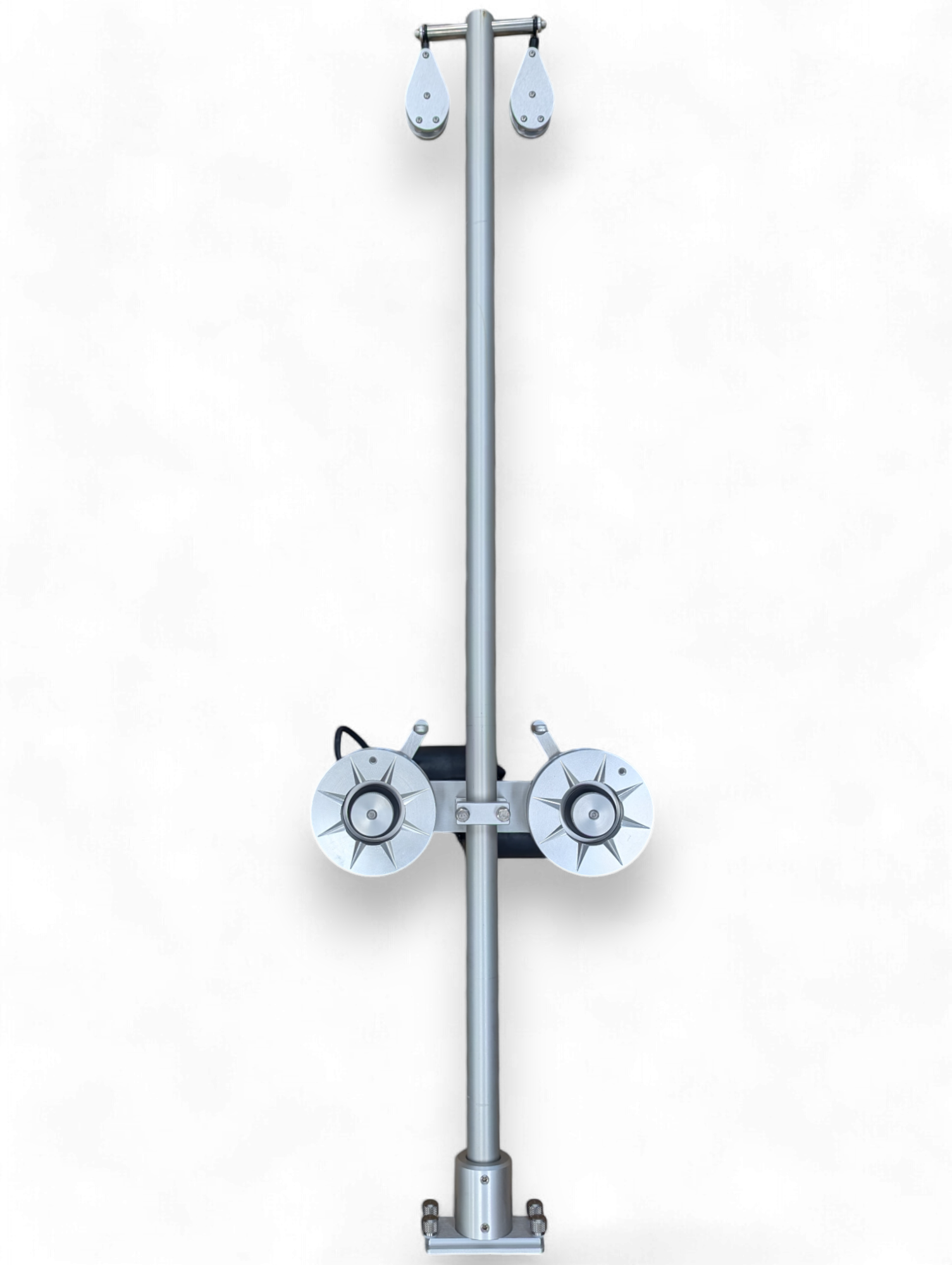 The masts with a Break-Away option are designed to be split in half to clear obstacles like bridges, garages, and electrical lines. The two halves are joined together by a machined aluminum collar and locked in place by custom knurled thumbscrews. The thumbscrews lock into indentations machined into the mast to ensure the material always fits securely together, with no material galling. An additional mounting base is also provided to store the mast vertically next to the other half of the mast to your planer mast lines do not need to be unspooled each time.