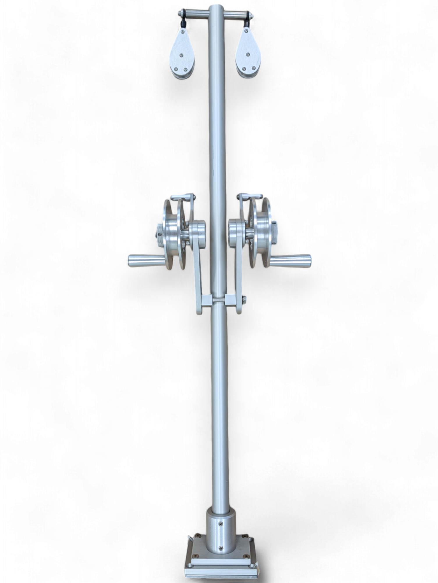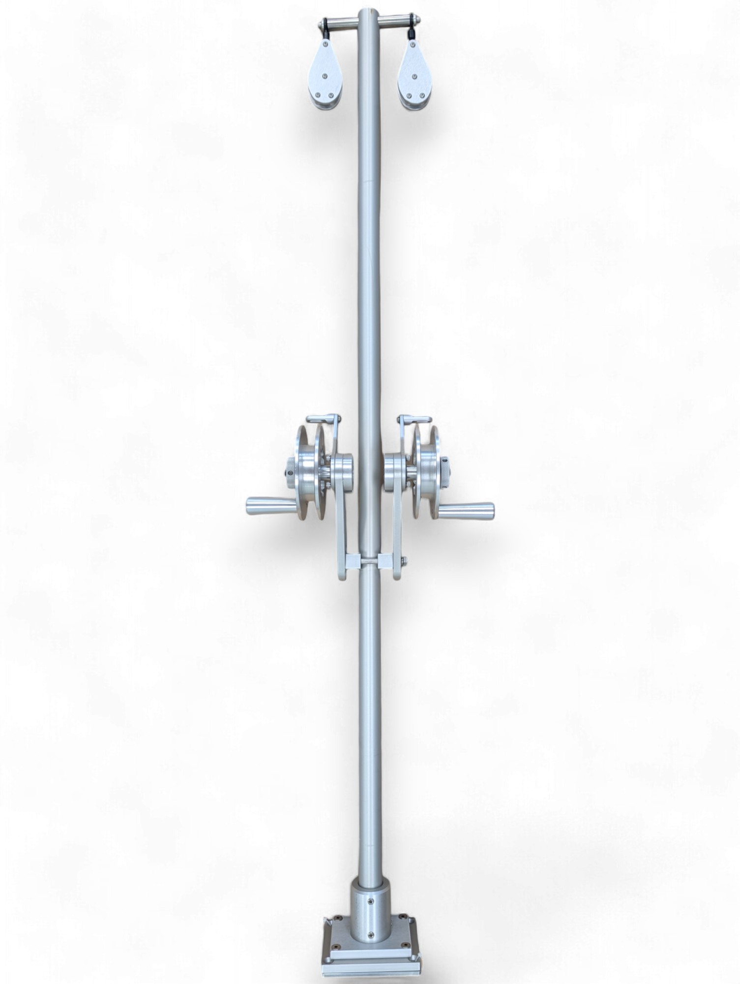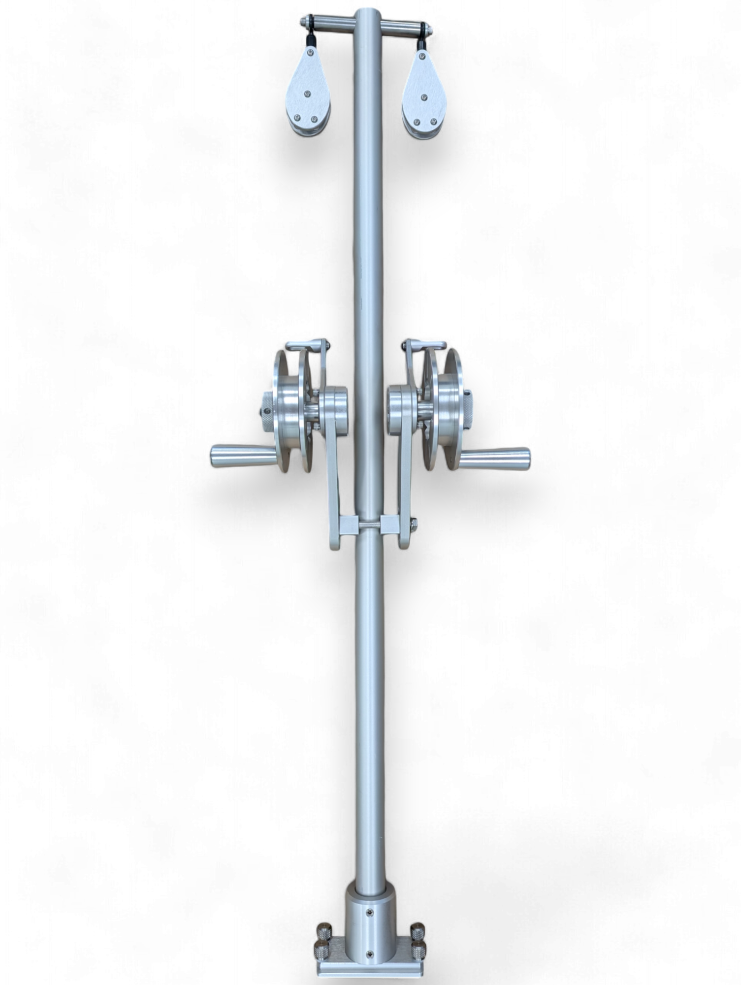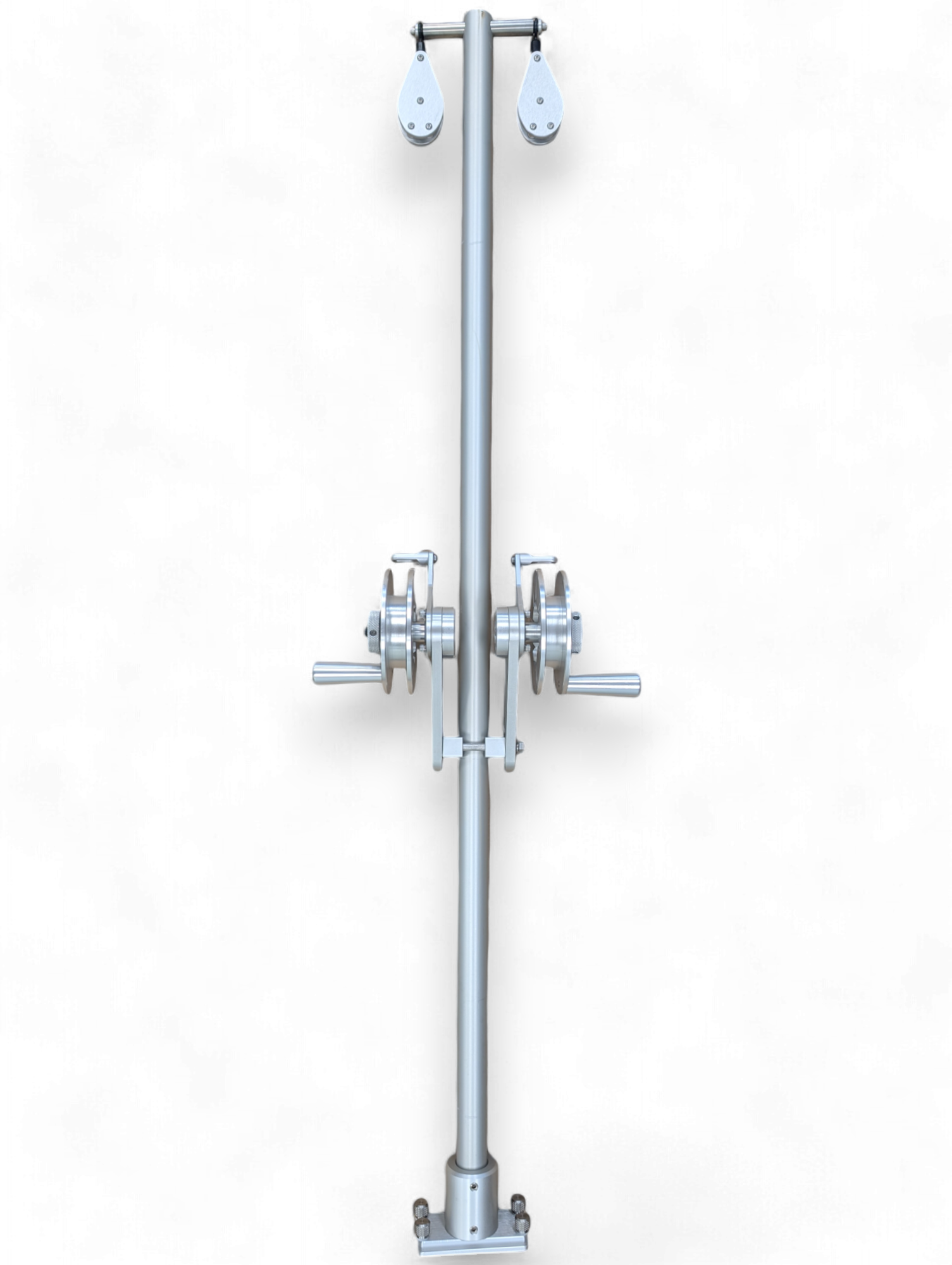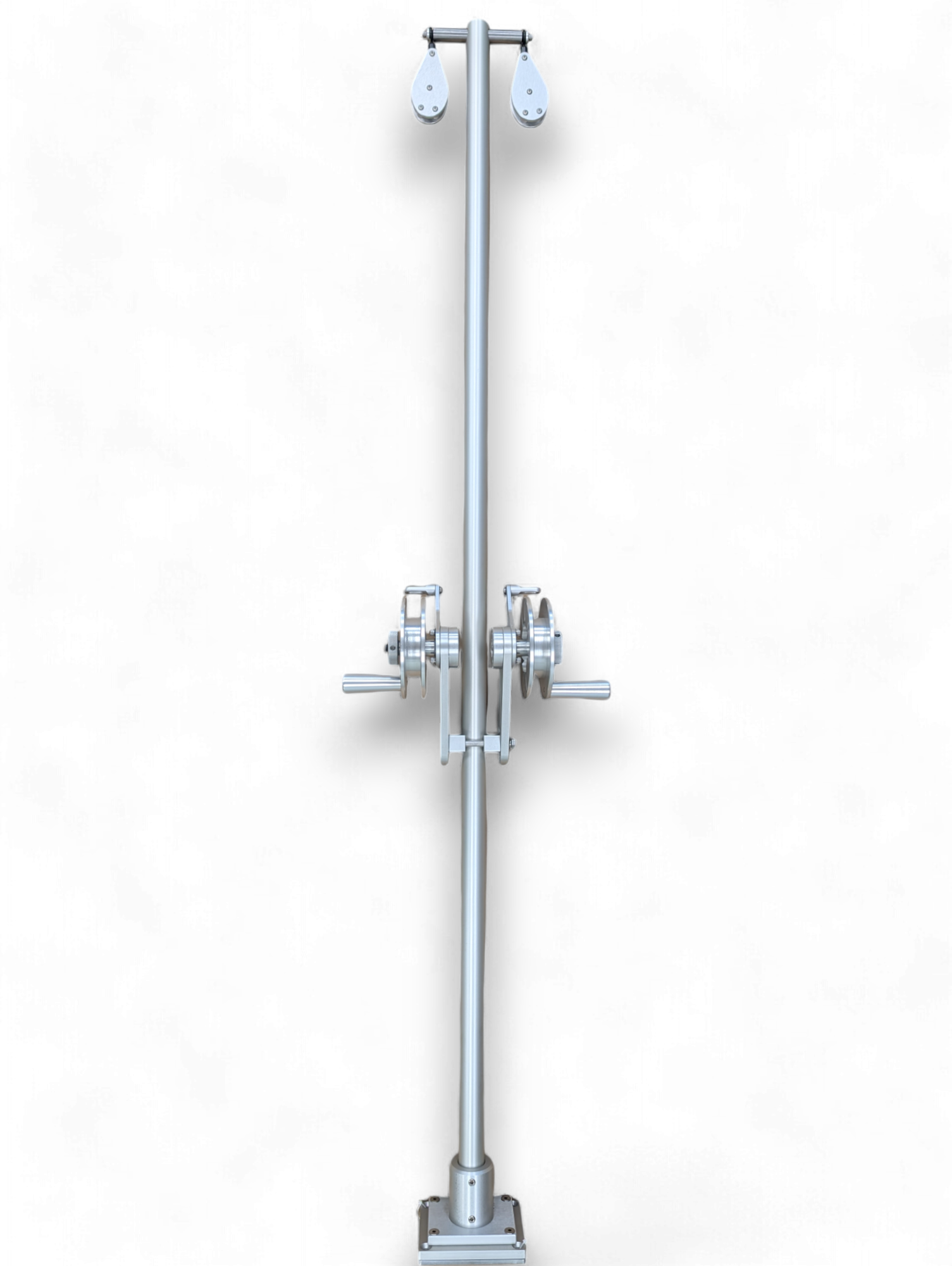 The planer mast includes a solid 1-1/2" mast with machined aluminum reels, line guides, variable clutches, aluminum clutch knobs, aluminum cased pulleys with stainless steel sealed bearings, and a removable base. Revolving Handles are only included on the Manual Reels. It is recommended that you purchase a spare revolving handle to keep aboard your vessel in case of any intermittent power failure.