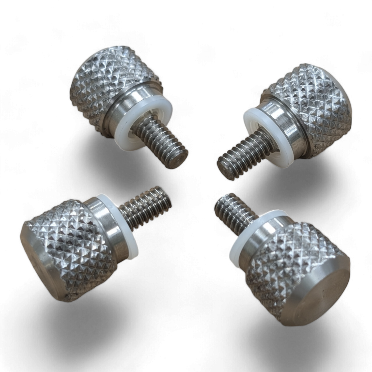 The thumbscrews also come with a synthetic polymer washer which sits at the top of the threaded shaft. This washer acts as a buffer between your stainless steel and aluminum plates to avoid scratching or dulling the anodized aluminum!