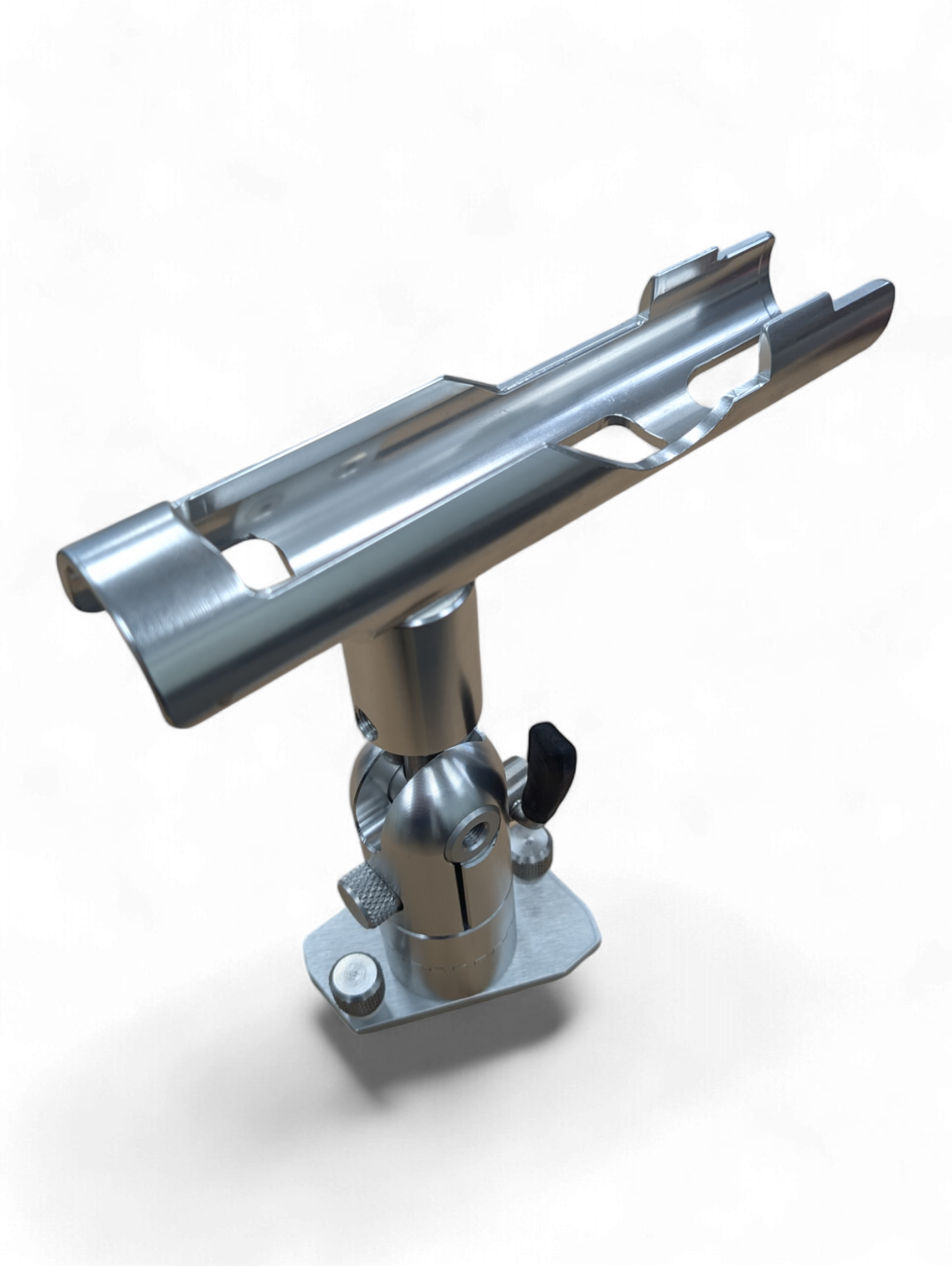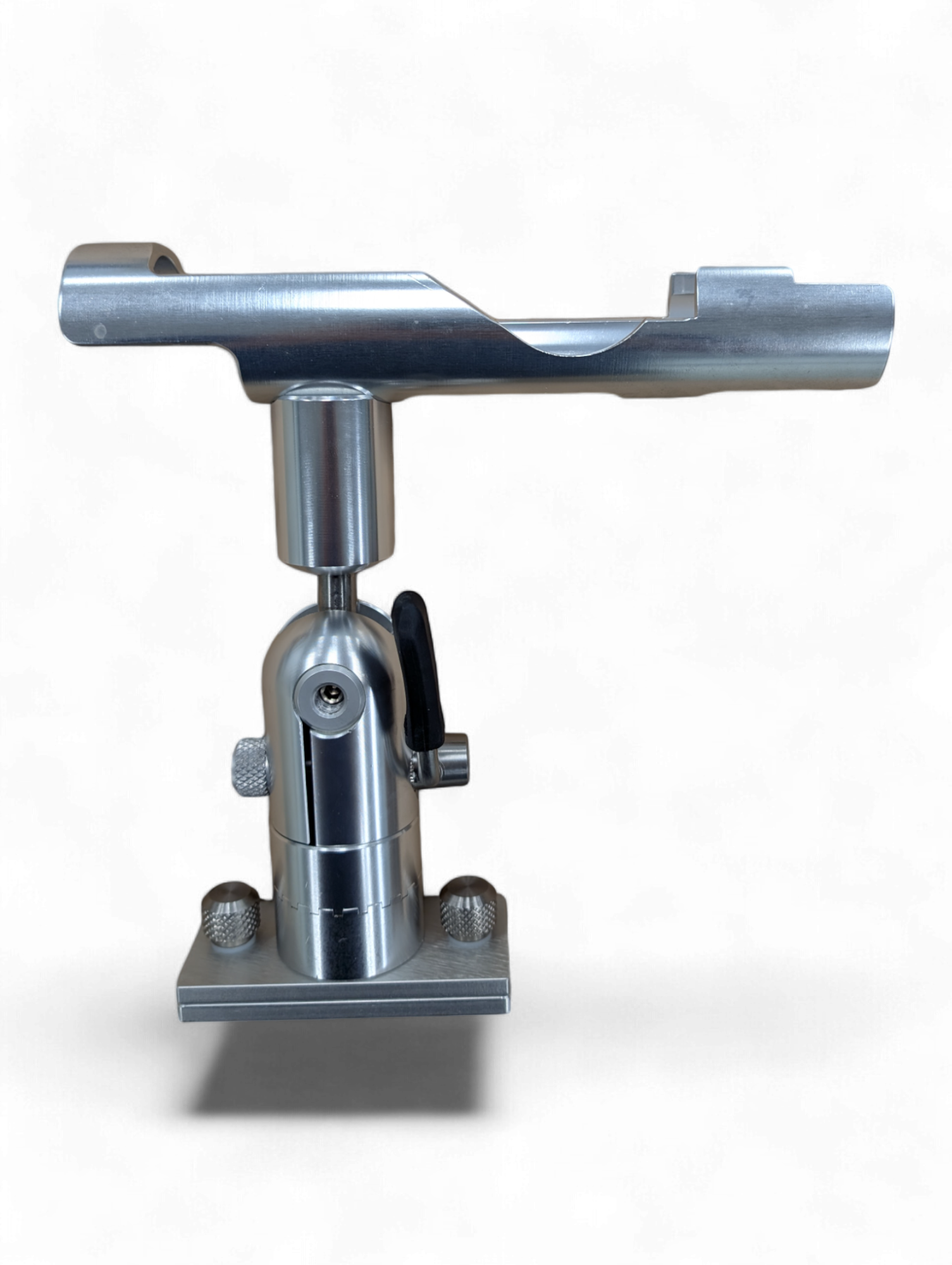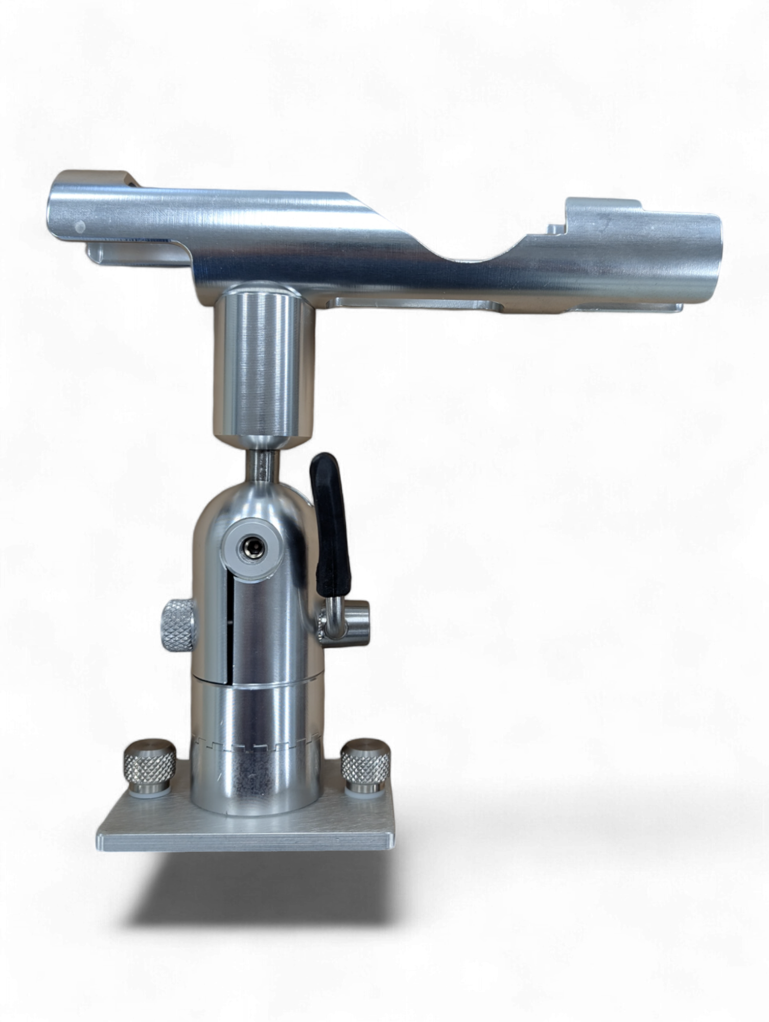 In addition to the radial movement, the cradle will adjust to any angle from 0-135° by actuating the padded lever. The lever can be rotated in any direction to meet the needs of each user. No tools are required for positioning of the rod holder. All aluminum components are anodized to military specs.