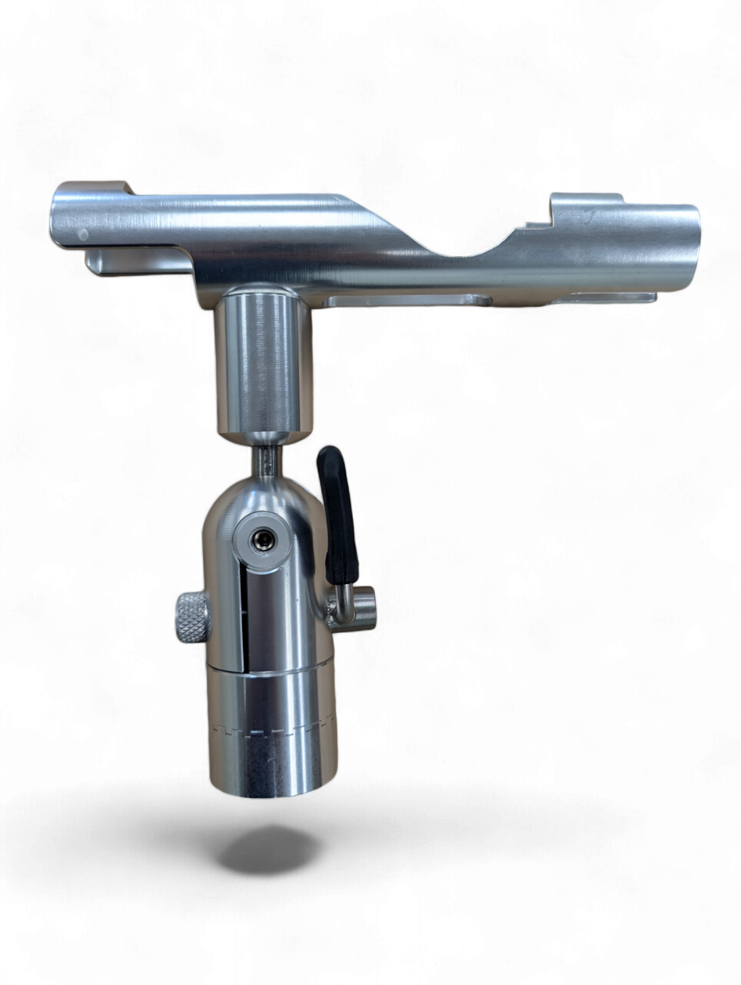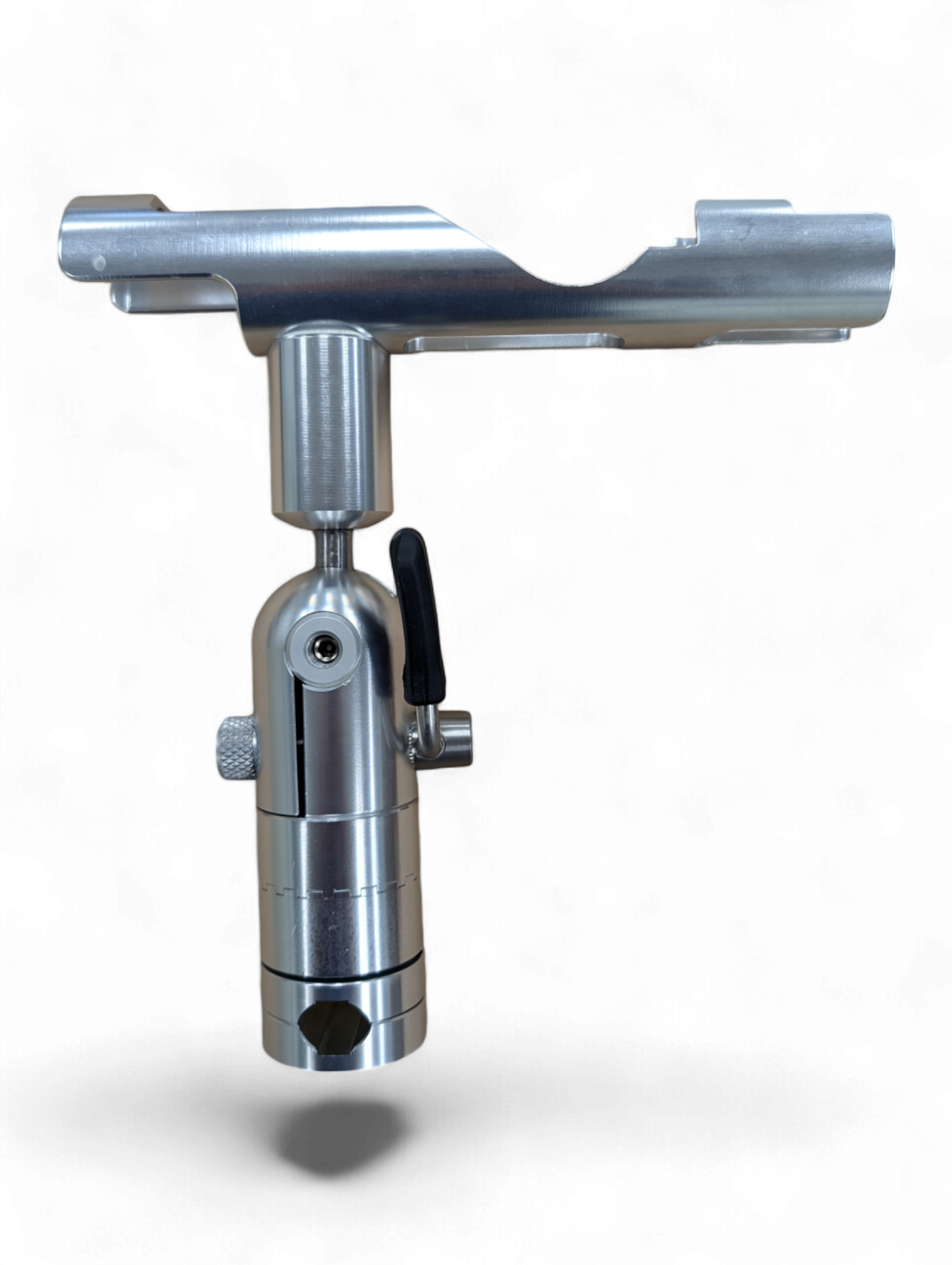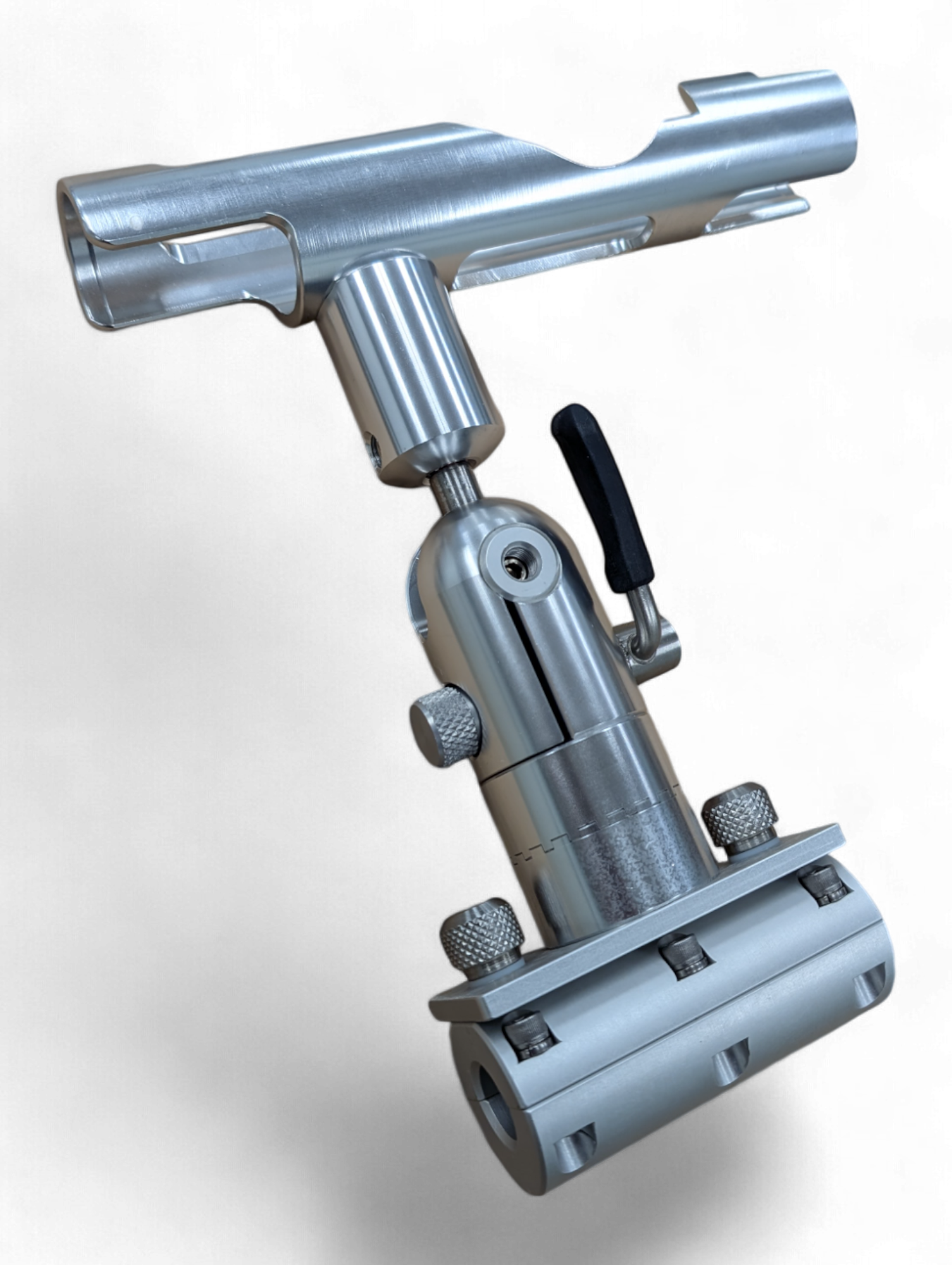 In addition to the radial movement, the cradle will adjust to any angle from 0-135° by actuating the padded lever. The lever can be rotated in any direction to meet the needs of each user. No tools are required for positioning of the rod holder. All aluminum components are anodized to military specs.