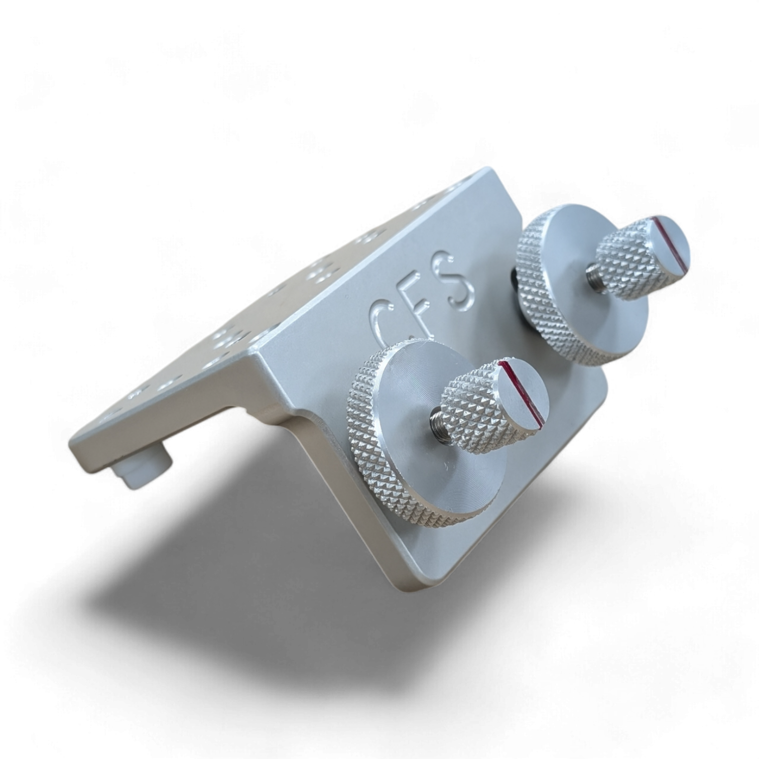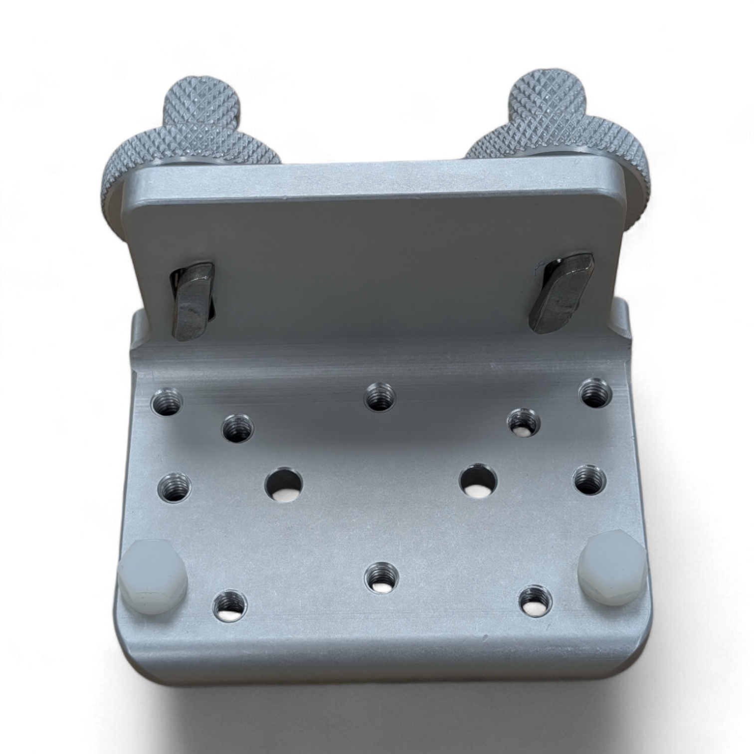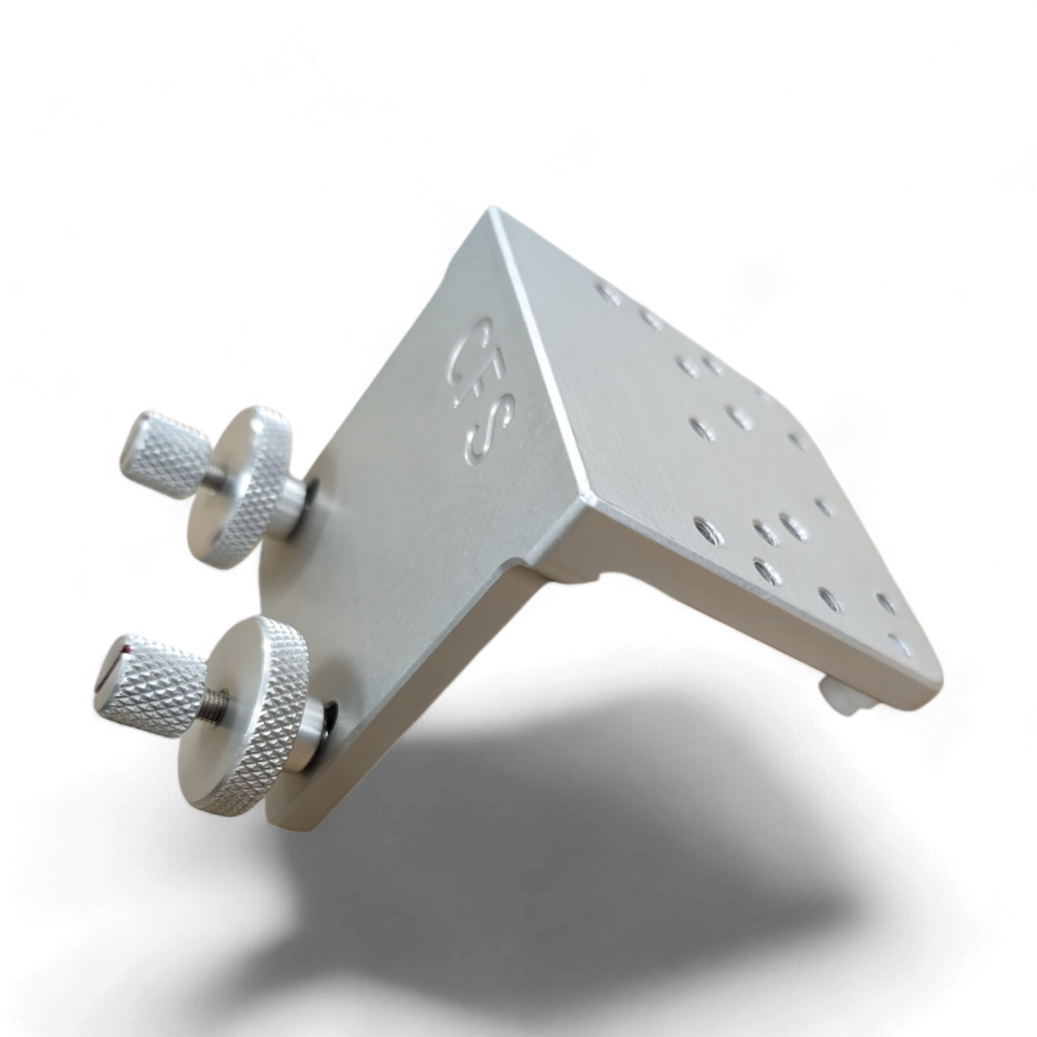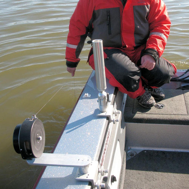 The 90° Lund mount is machined from a solid piece of aluminum bar and is pressed to create the angled bend. The slotted keys are made from stainless steel and are attached to all solid aluminum components which complete the round knobs. You will know when your unit is locked into place when the red line gauge is in the vertical position. Also, provided with this unit are two synthetic levelers at the end of the unit to give the mount added support and to protect the gunnel from unnecessary scratches.