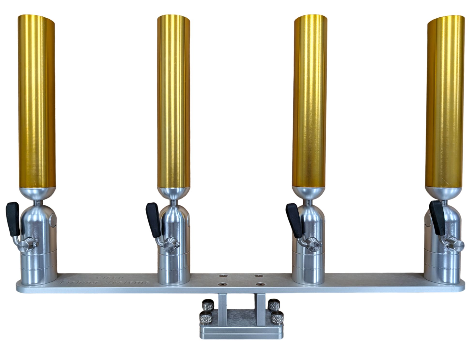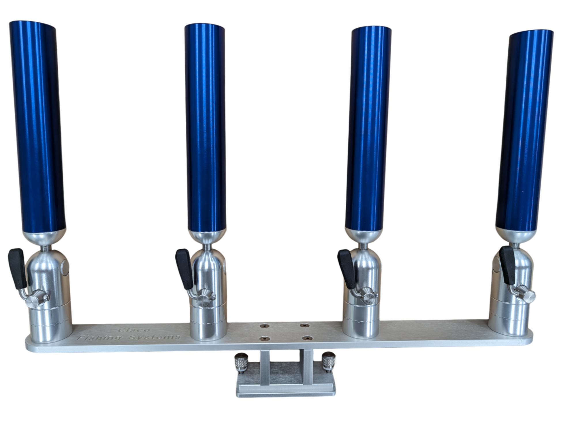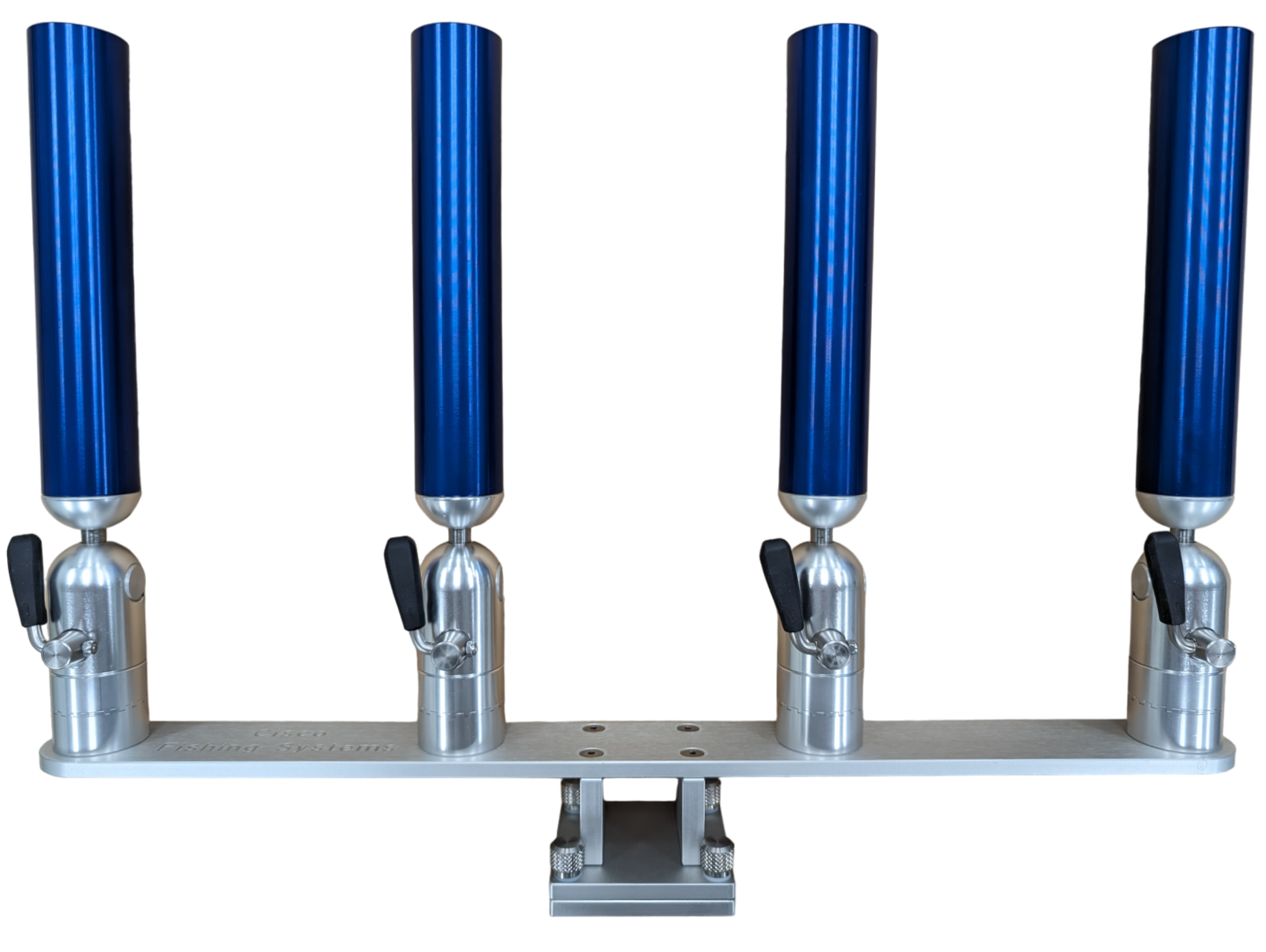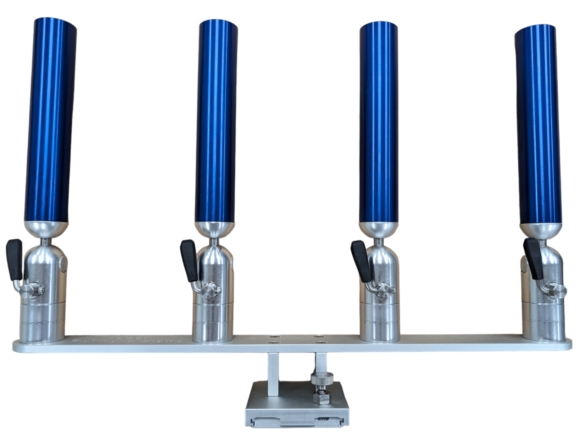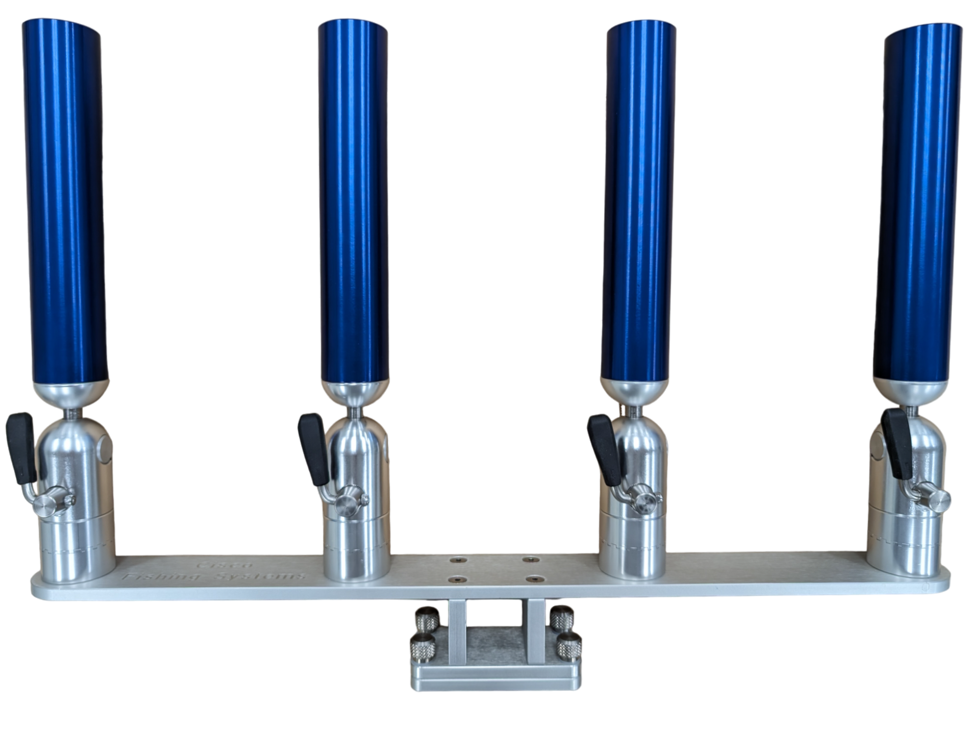 The quad rod holders are available in various mounting platforms. Having the rod holders attached to the triple plate allows for quick and easy removal of multiple rod holders from the vessel. All of our triple setups are available in Silver, Blue, Black or Gold to match your vessels personality.