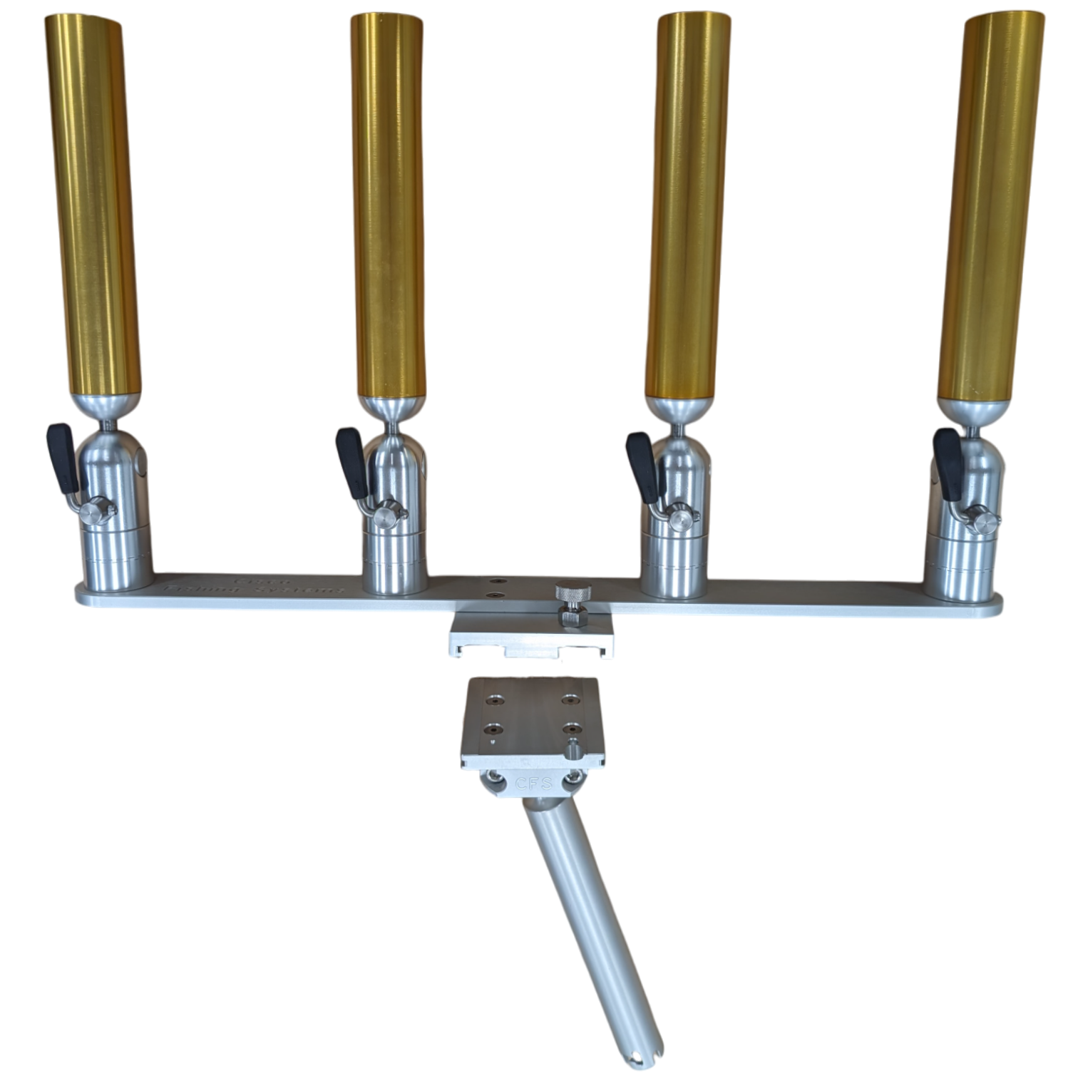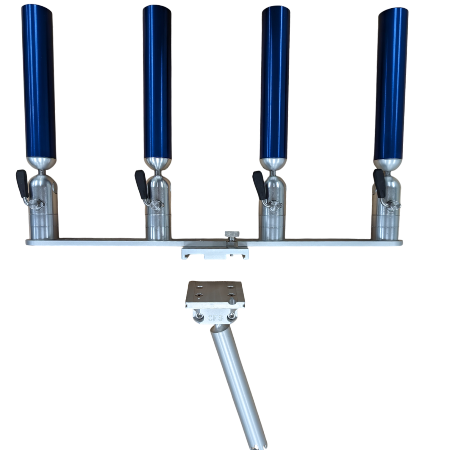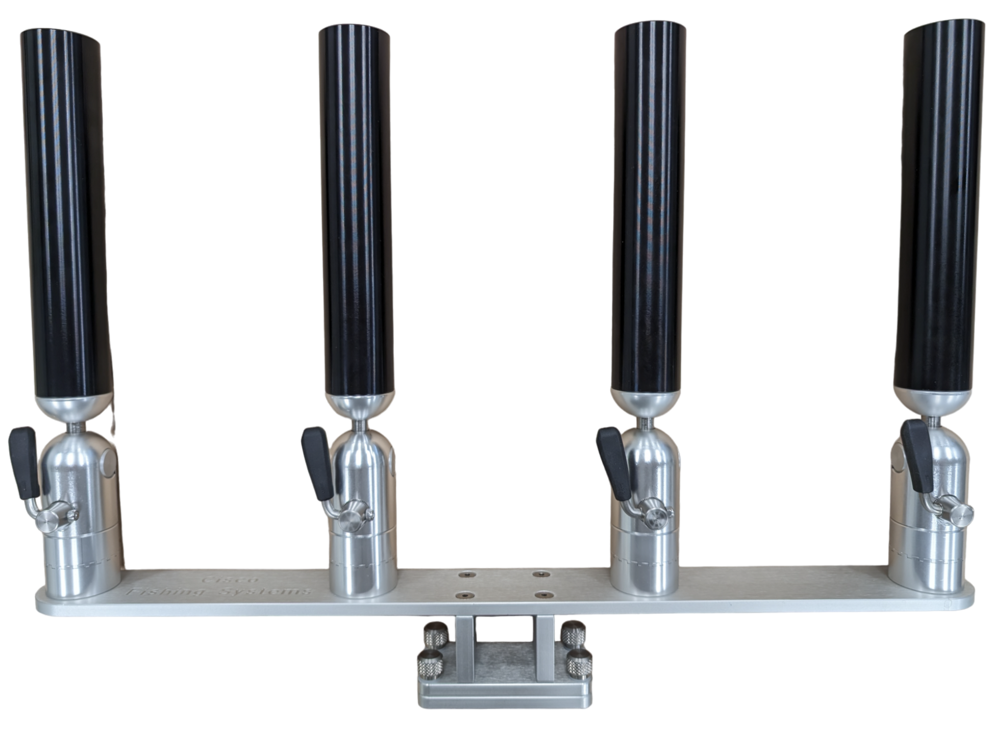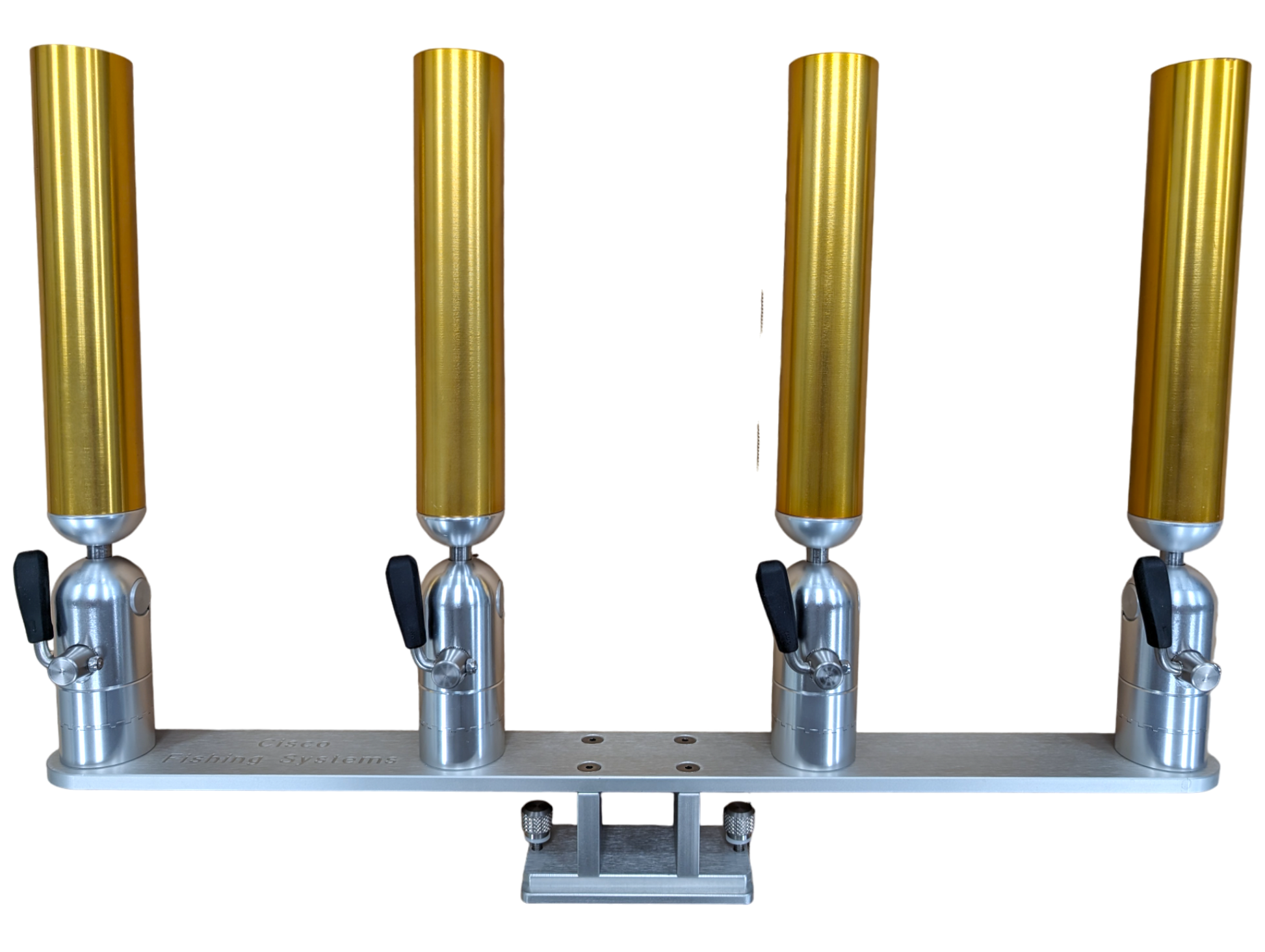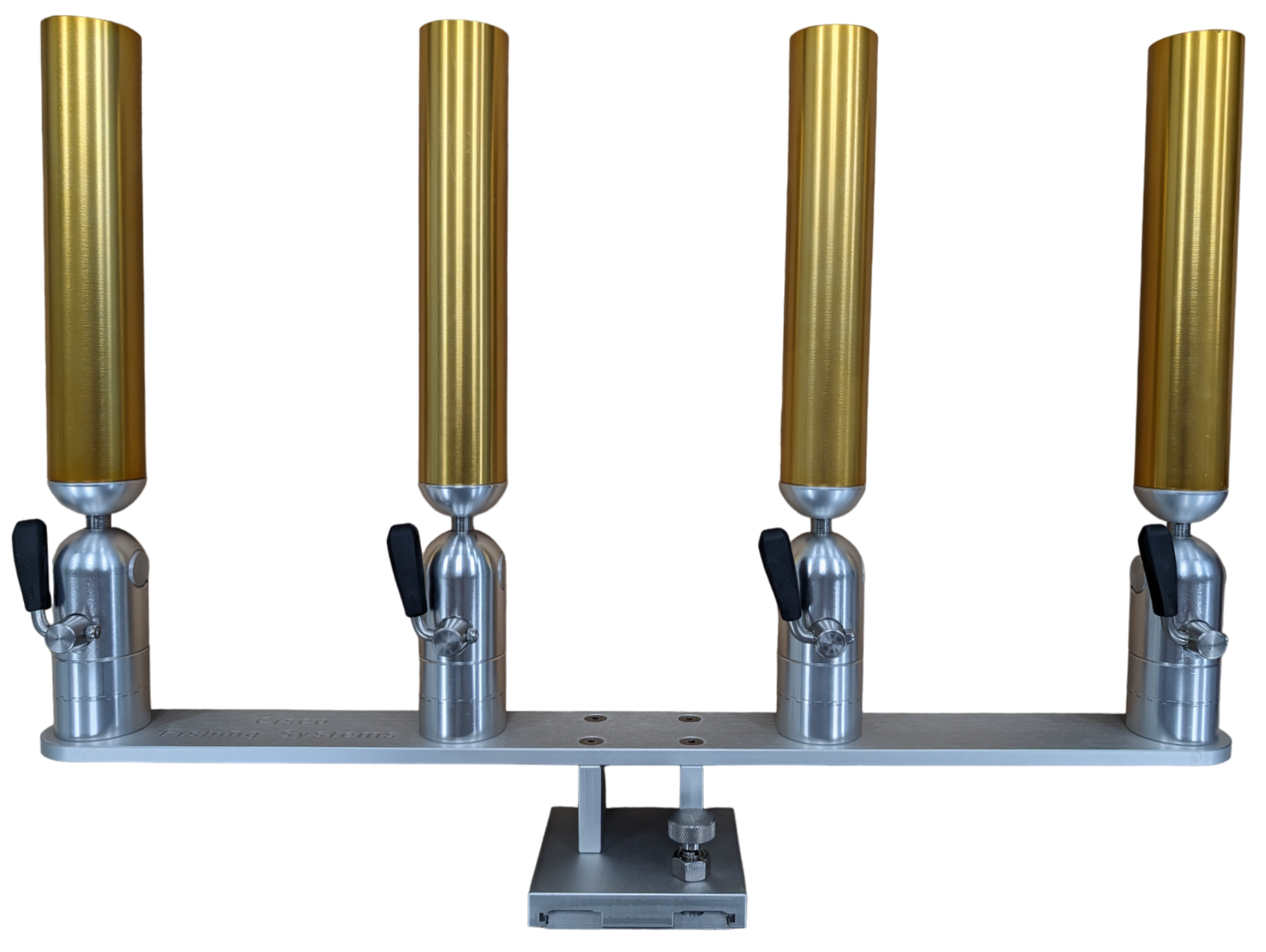 The quad rod holders are available in various mounting platforms. Having the rod holders attached to the triple plate allows for quick and easy removal of multiple rod holders from the vessel. All of our triple setups are available in Silver, Blue, Black or Gold to match your vessels personality.