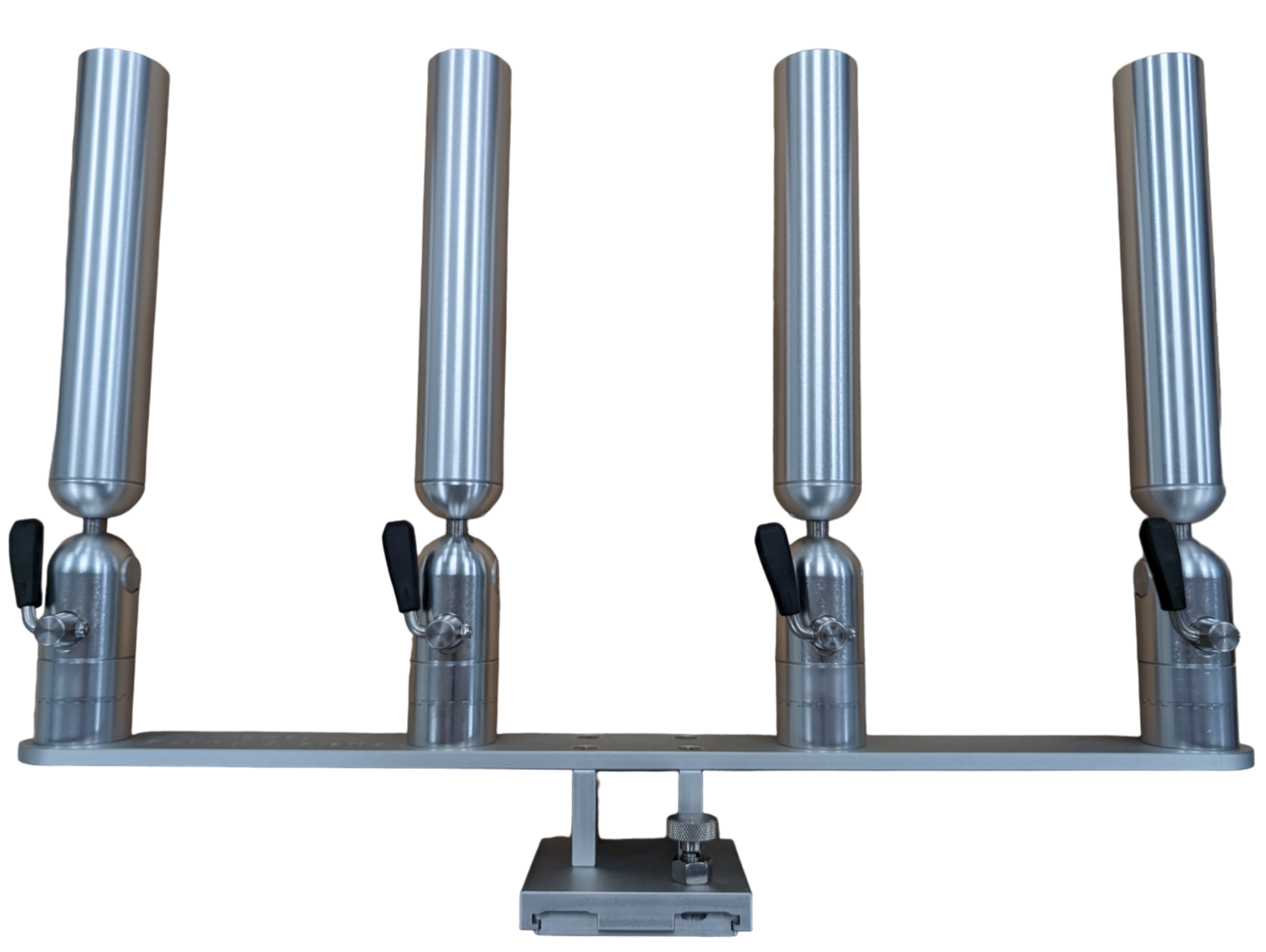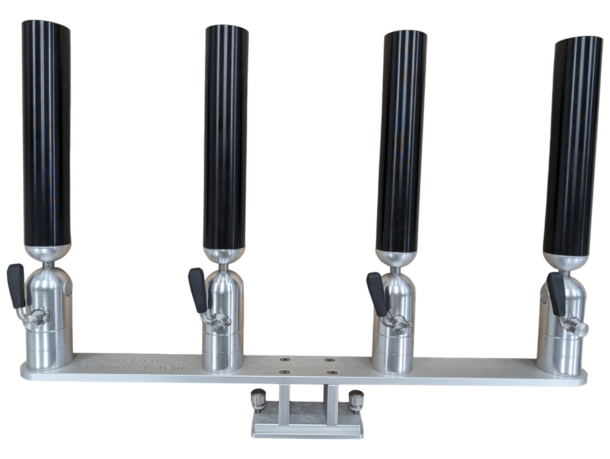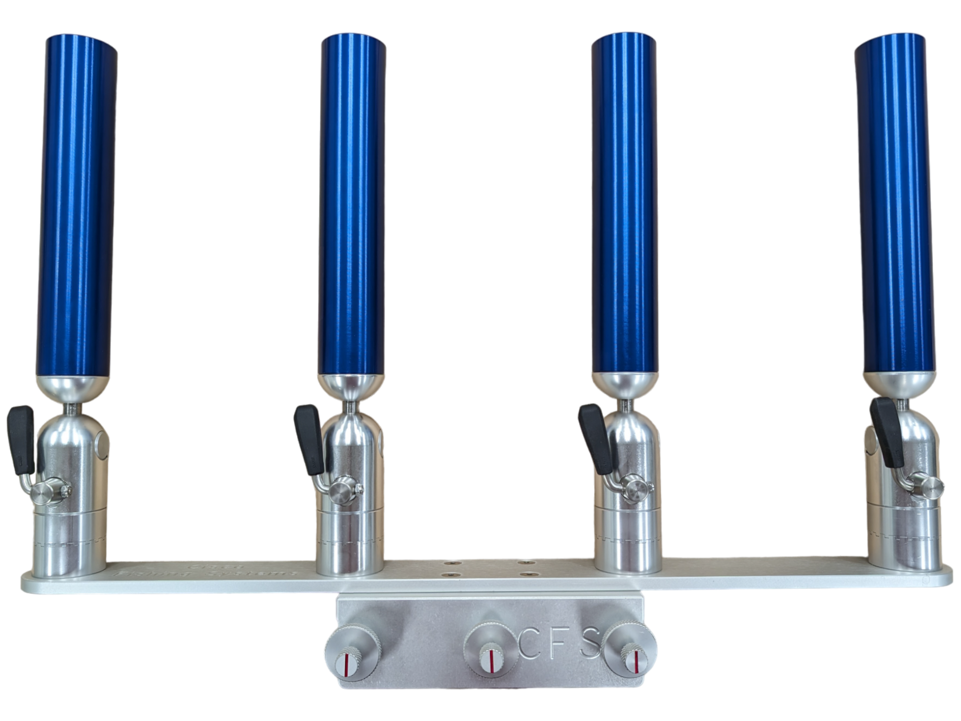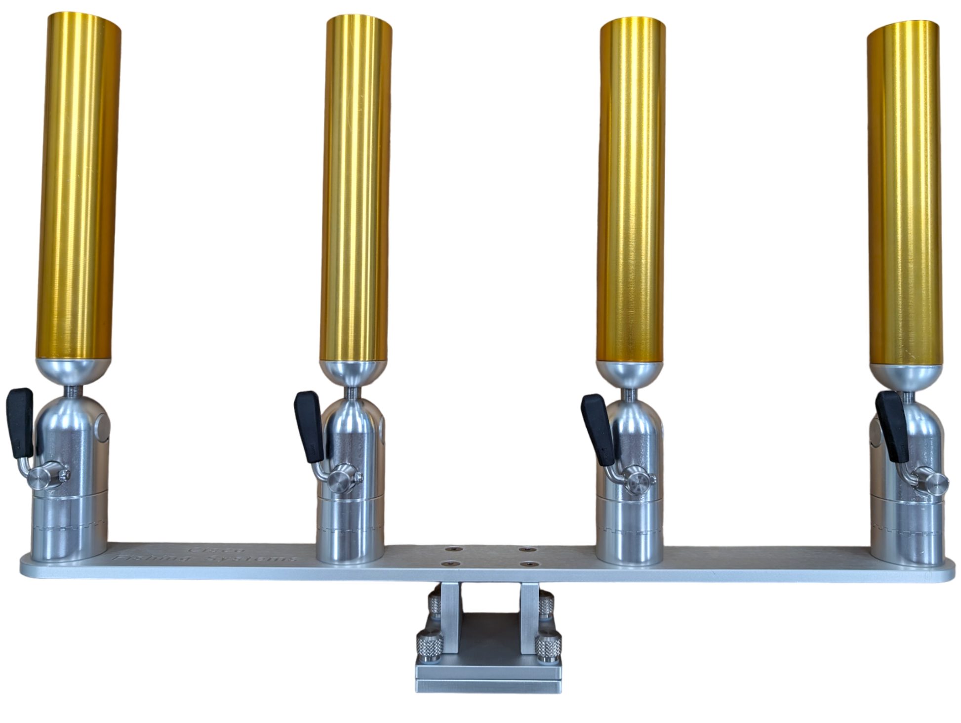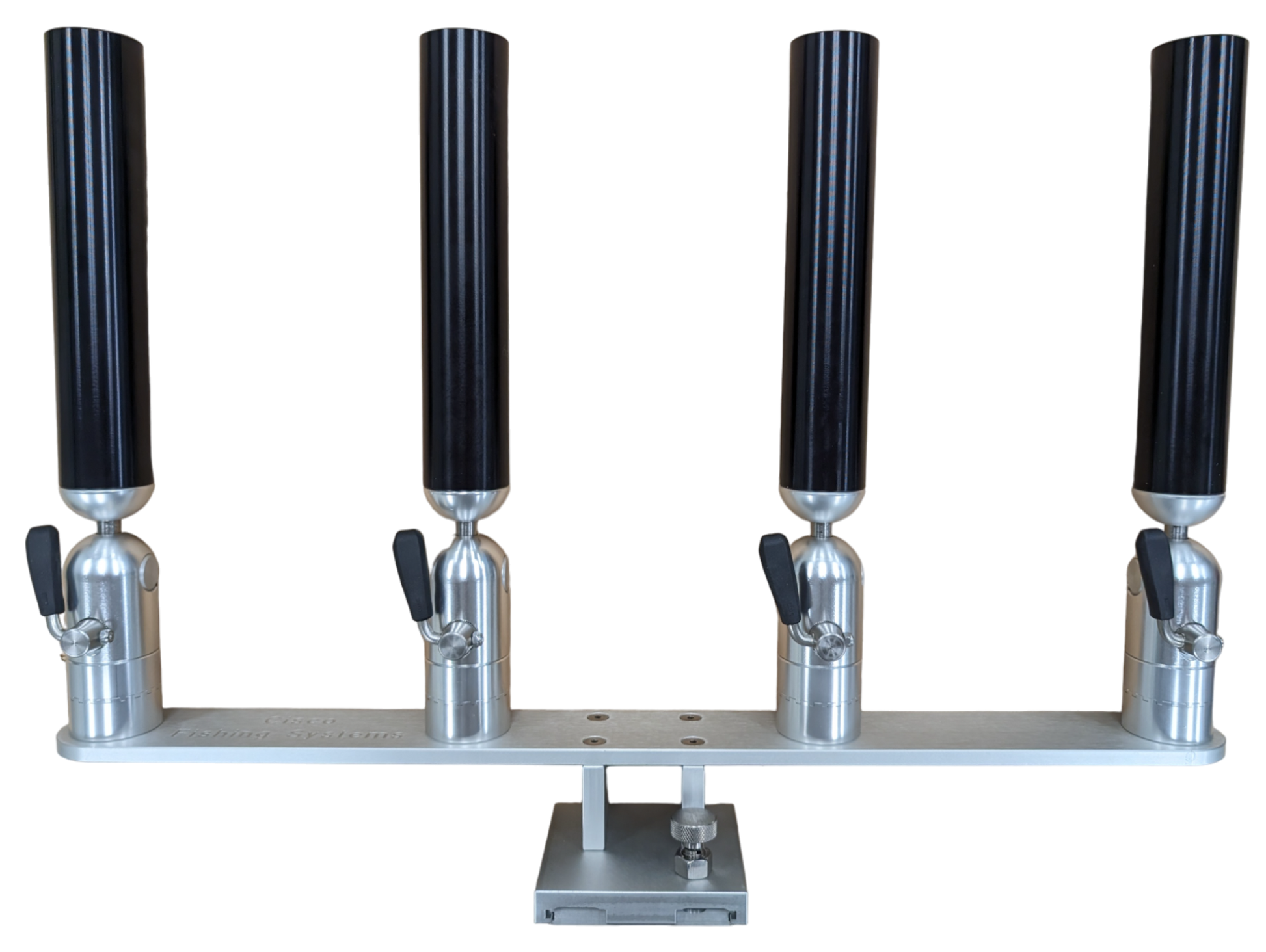 The quad rod holders are available in various mounting platforms. Having the rod holders attached to the triple plate allows for quick and easy removal of multiple rod holders from the vessel. All of our triple setups are available in Silver, Blue, Black or Gold to match your vessels personality.