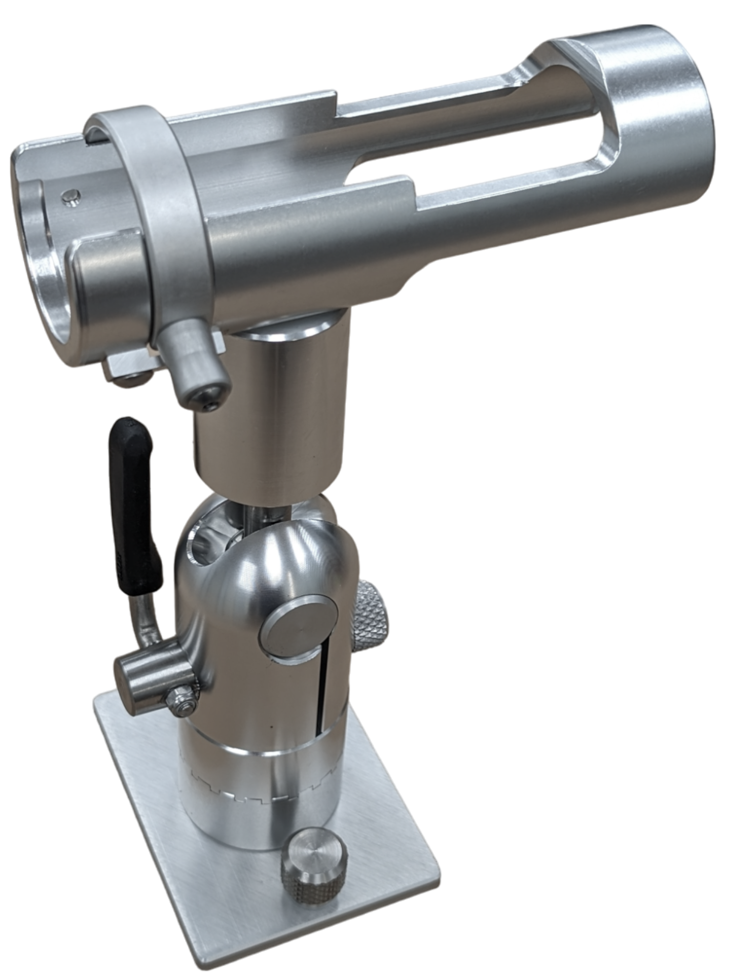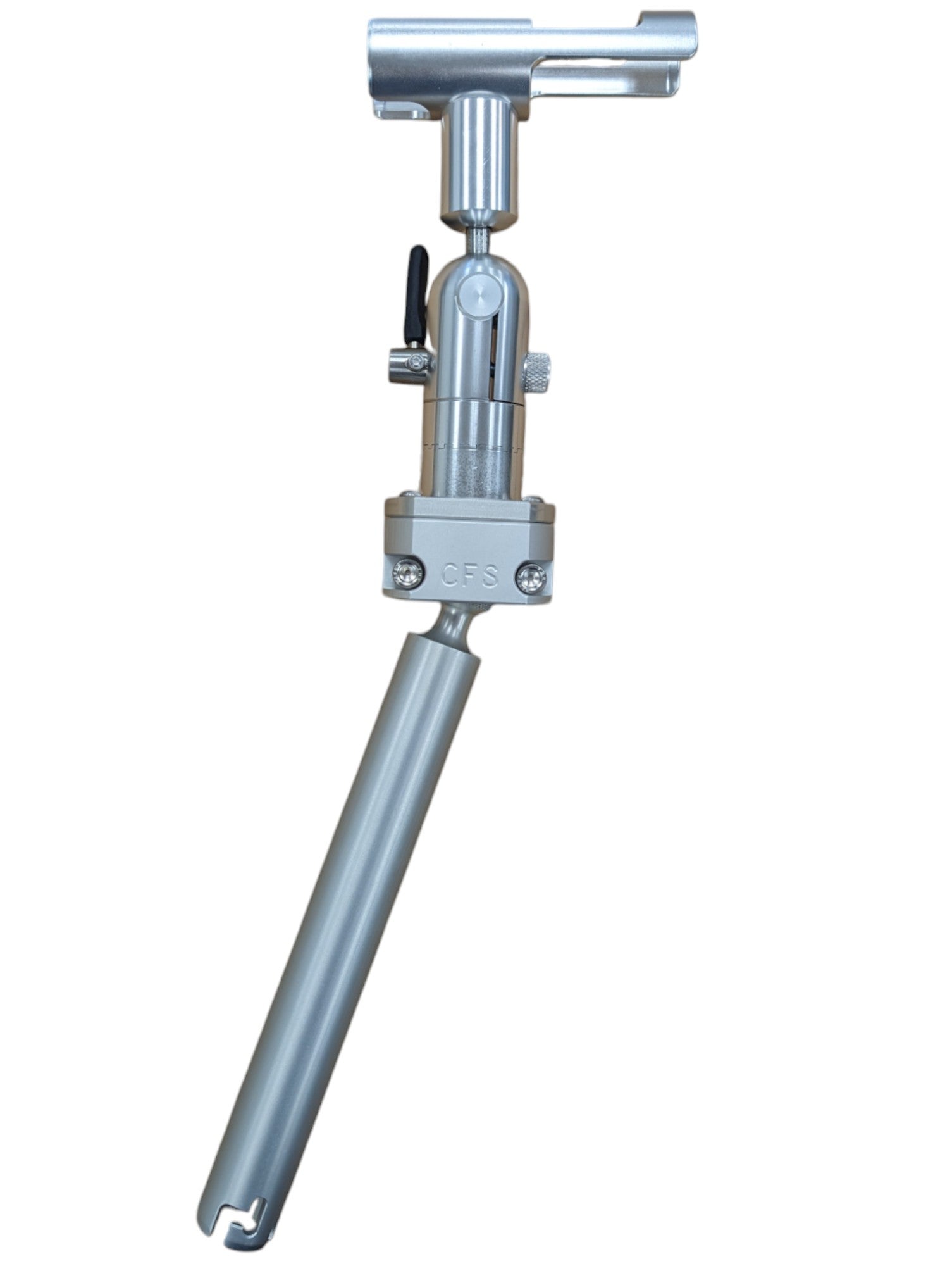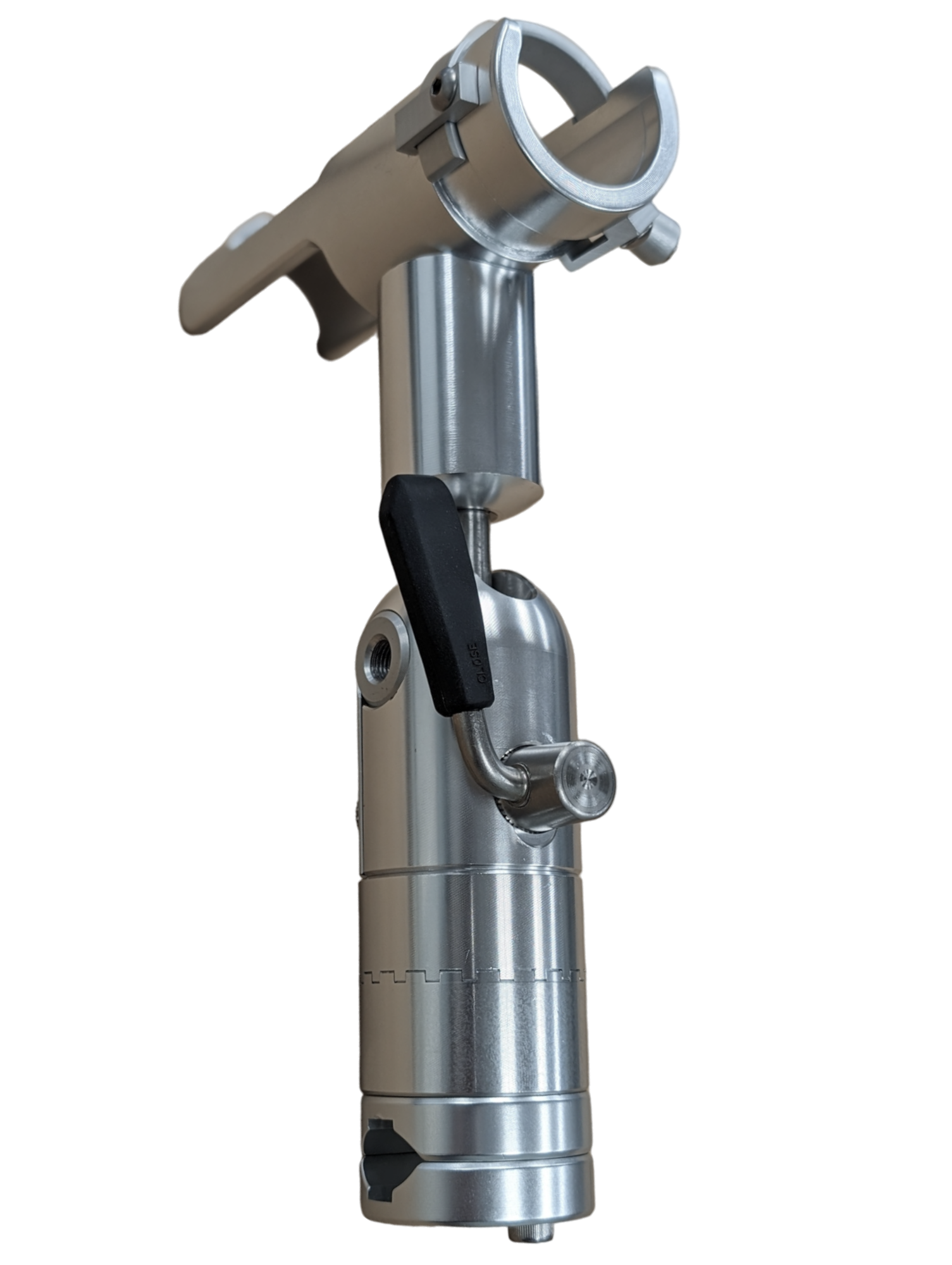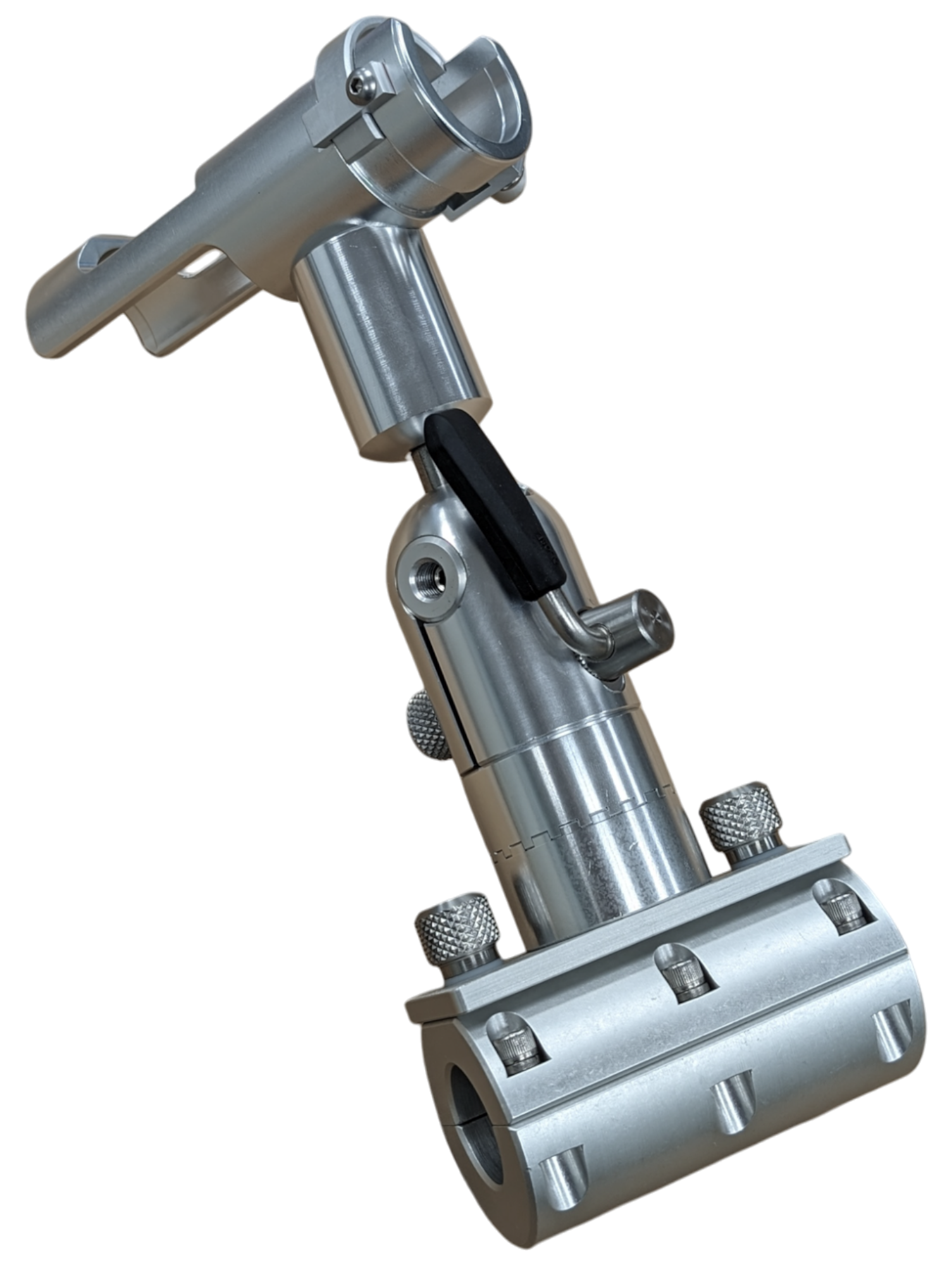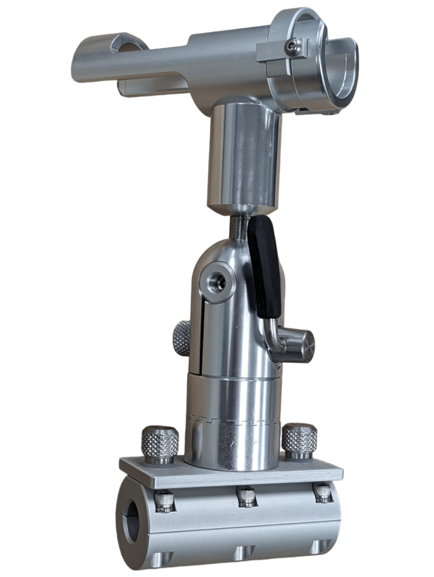 In addition to the radial movement, the tube will adjust to any angle from 0-90° by actuating the padded lever. The lever can be rotated in any direction so it locks in the downward position.
