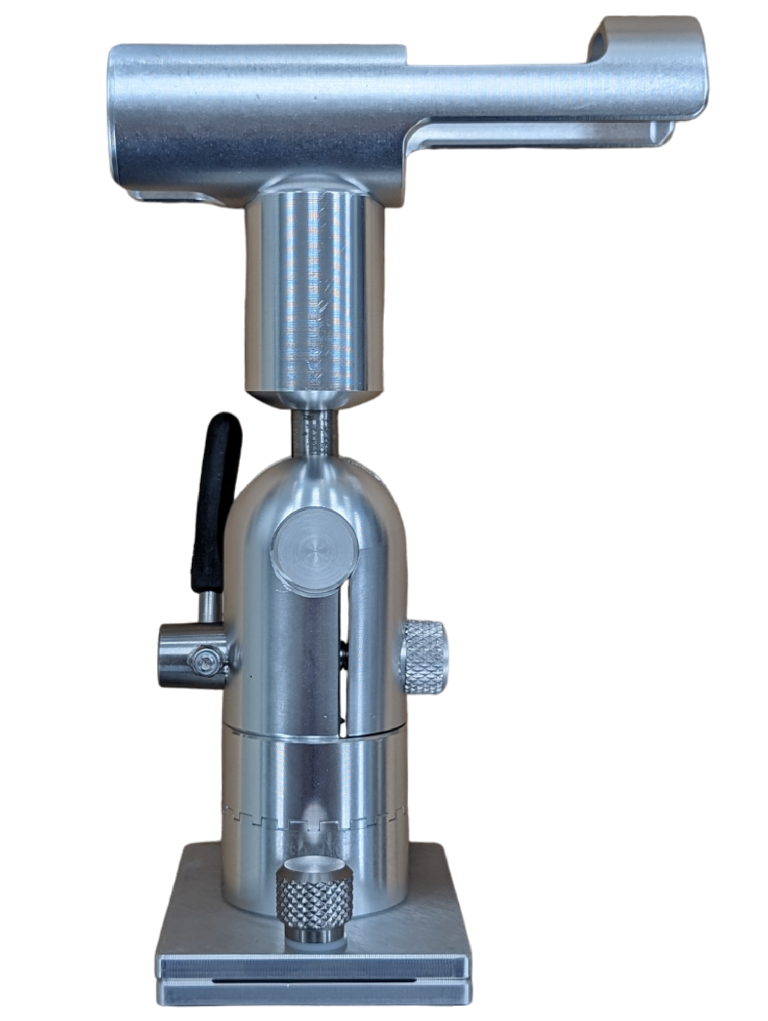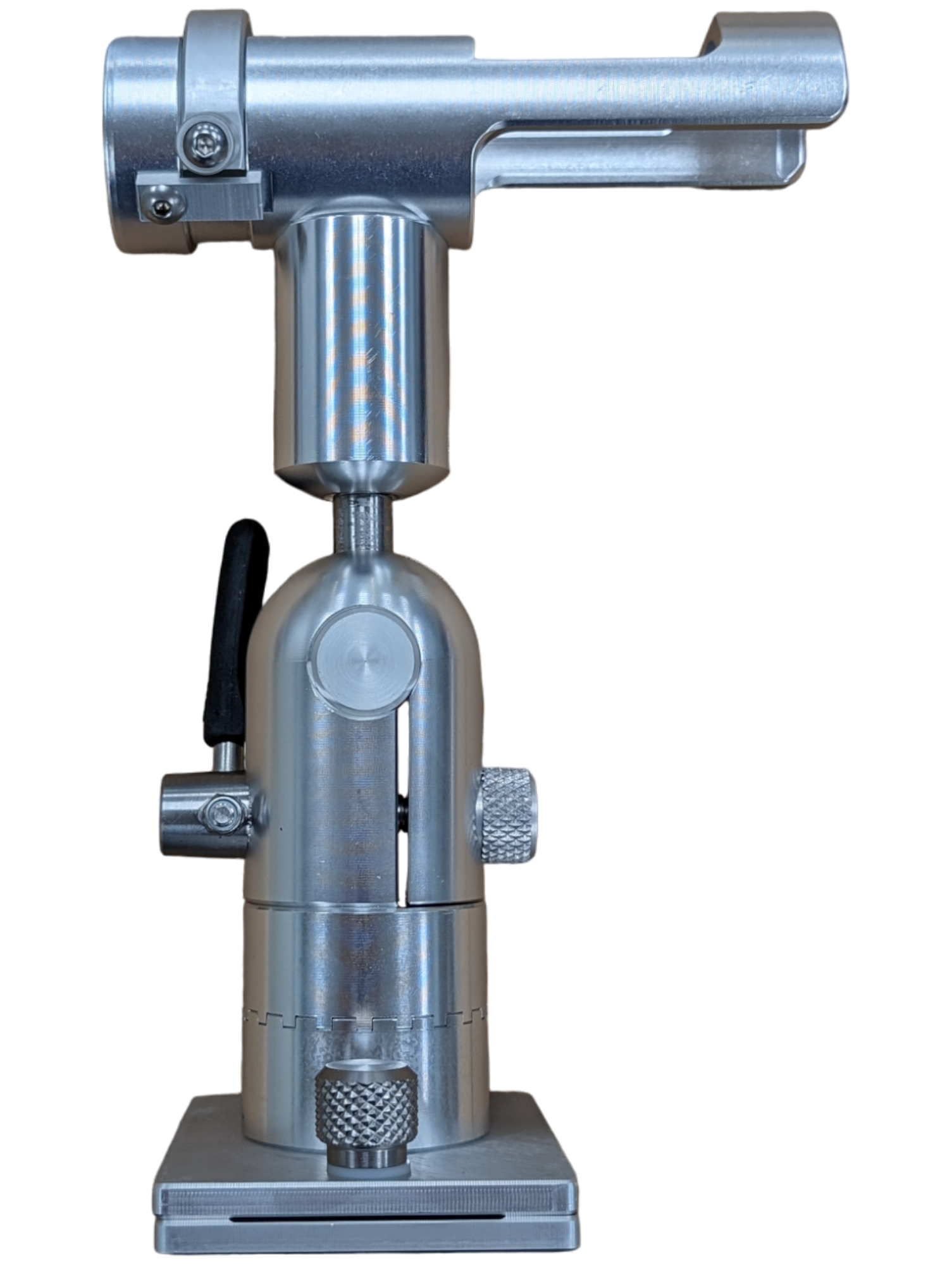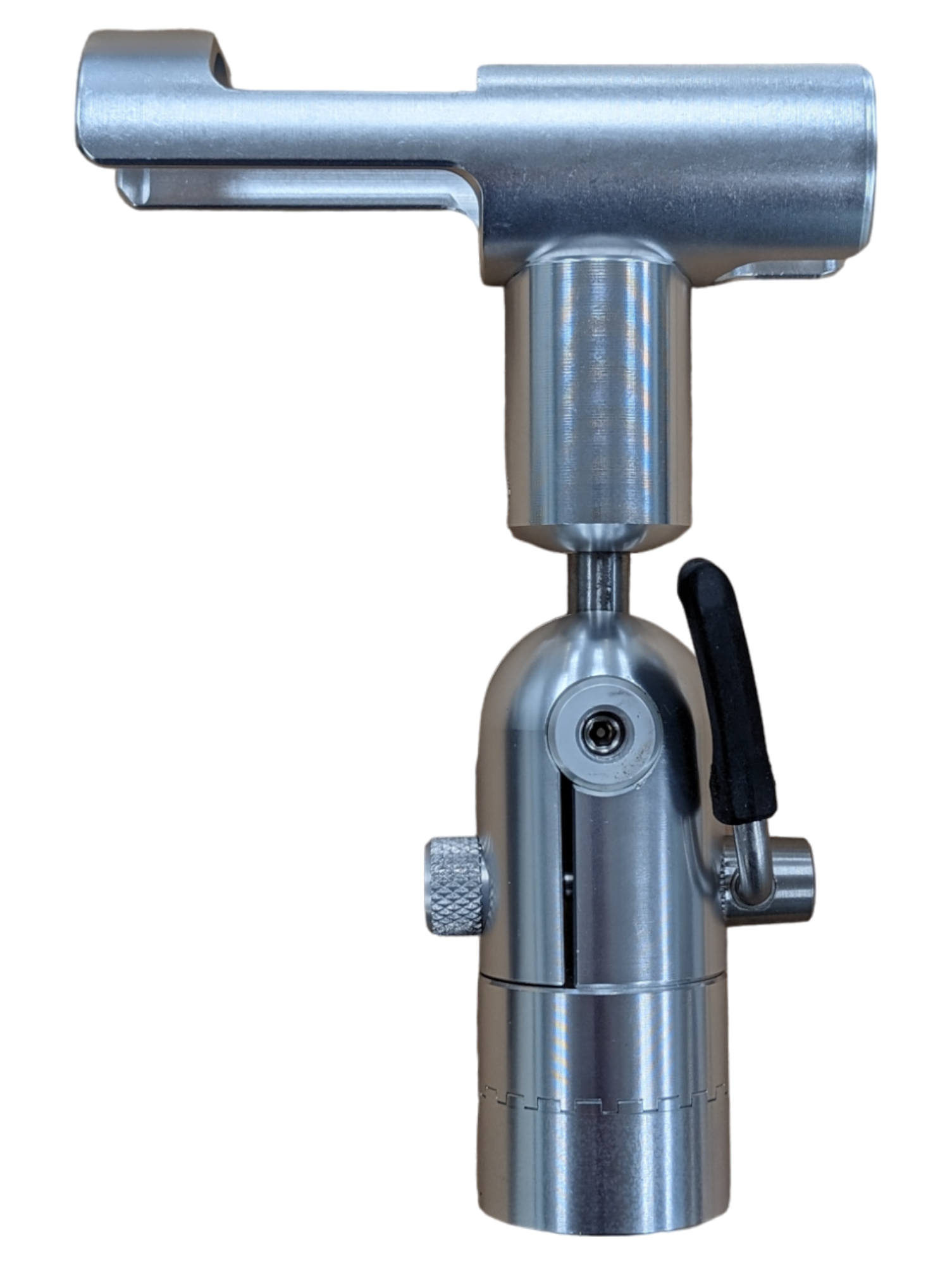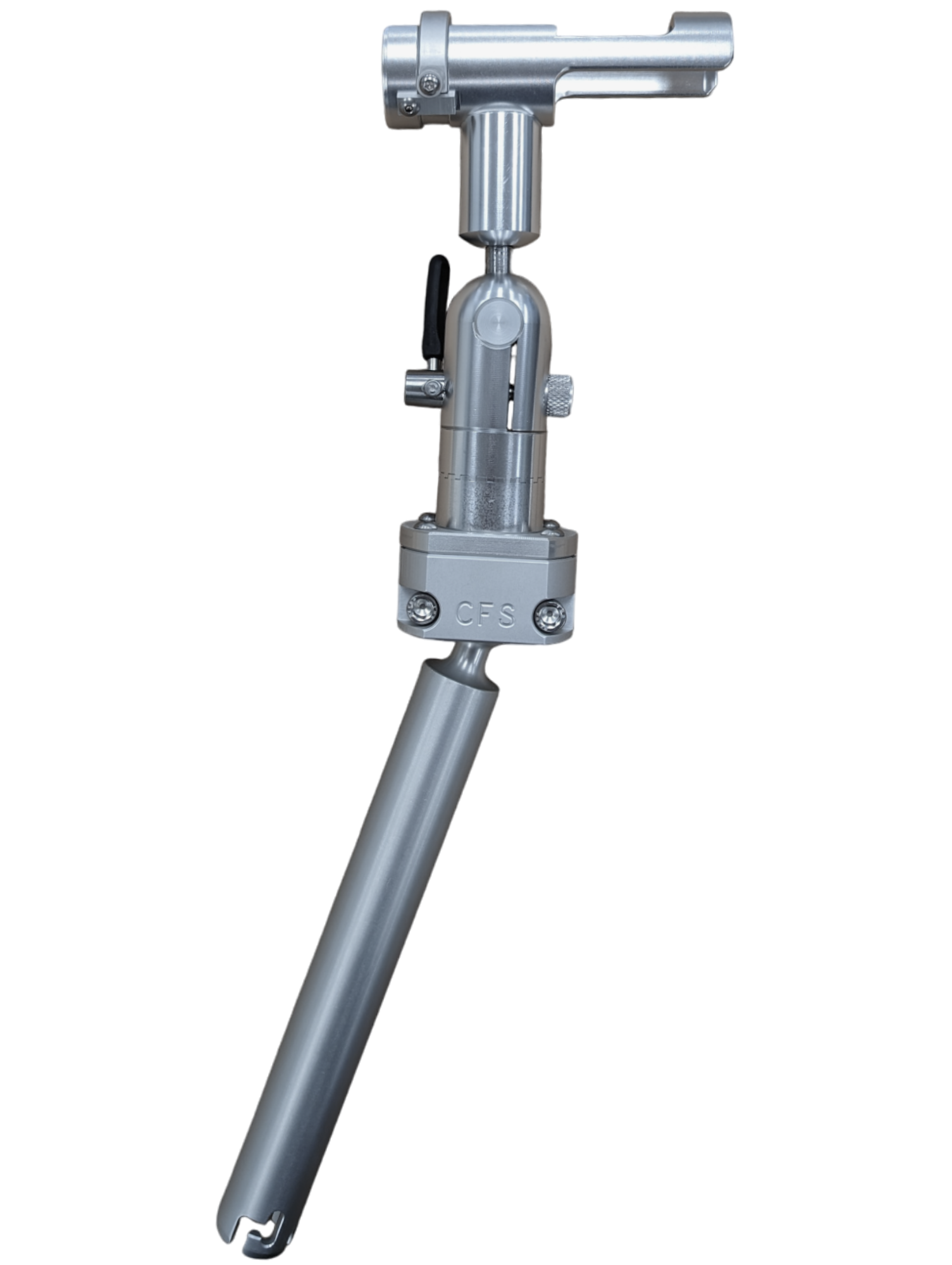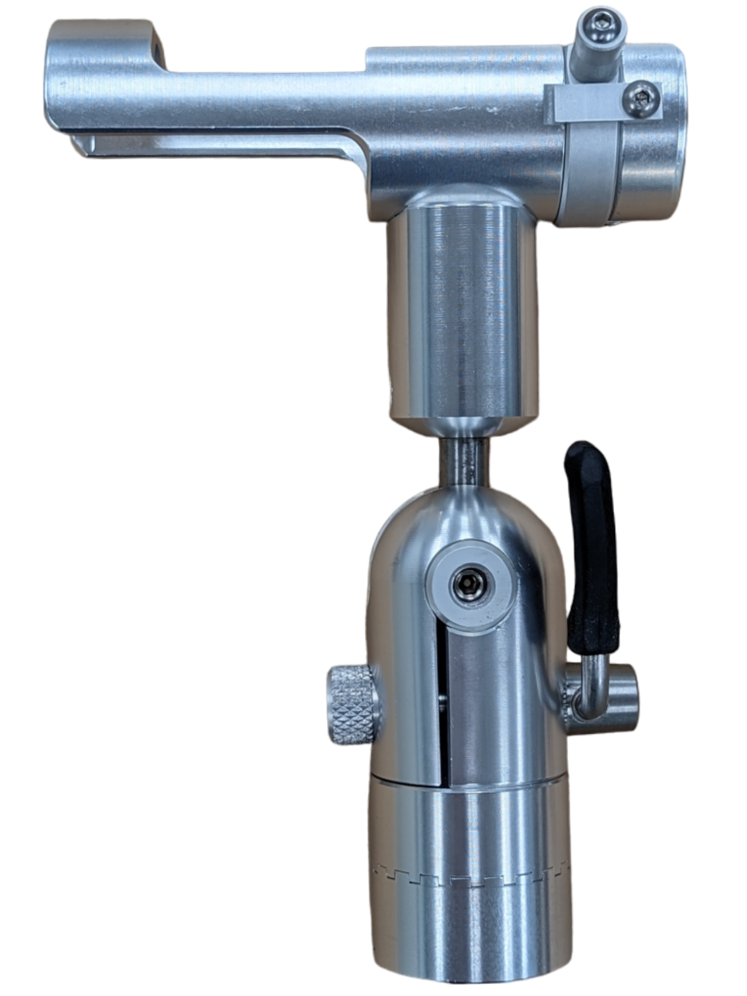 In addition to the radial movement, the tube will adjust to any angle from 0-90° by actuating the padded lever. The lever can be rotated in any direction so it locks in the downward position.